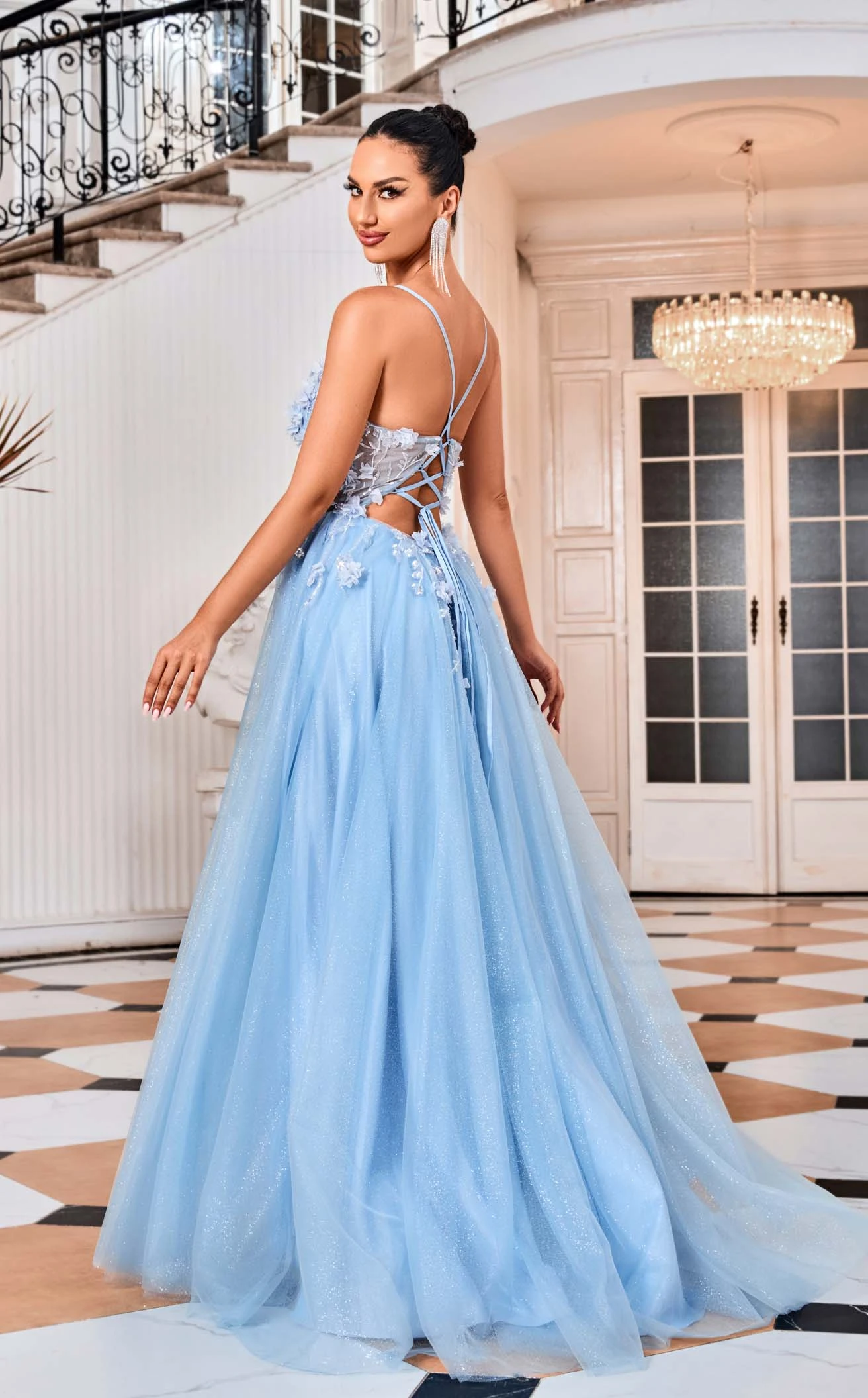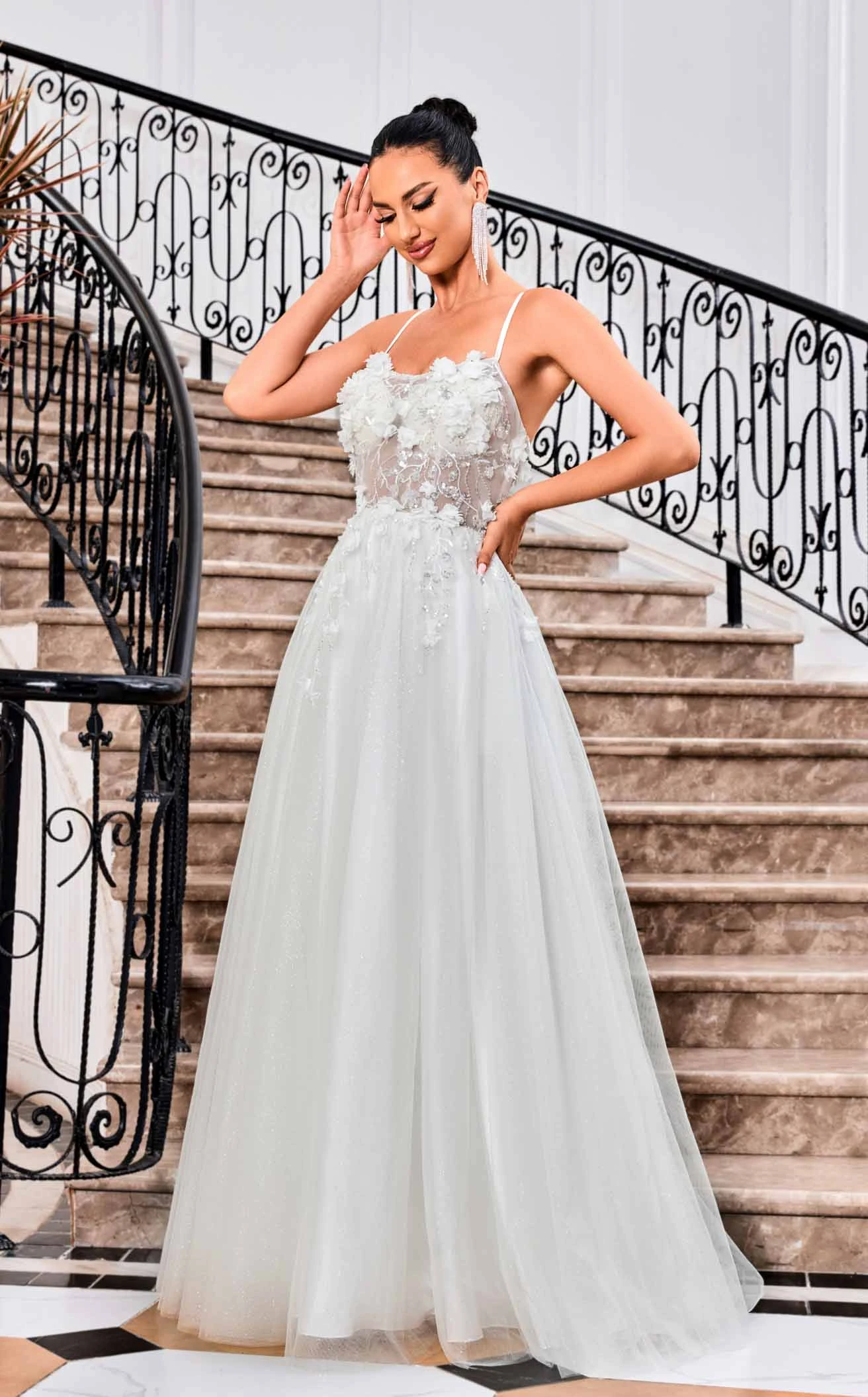 Enchant the crowd in this appealing J24001 Jadore gown. The sleeveless bodice accompanies a round neckline and a lace-up open back. Its floral applique runs to the waistline and is accompanied by a sheer mesh for modesty. The natural silhouette flows into a ballgown skirt with a shimmer mesh overlay. Ending with a sweep train, this gown puts a twirl to your walk.