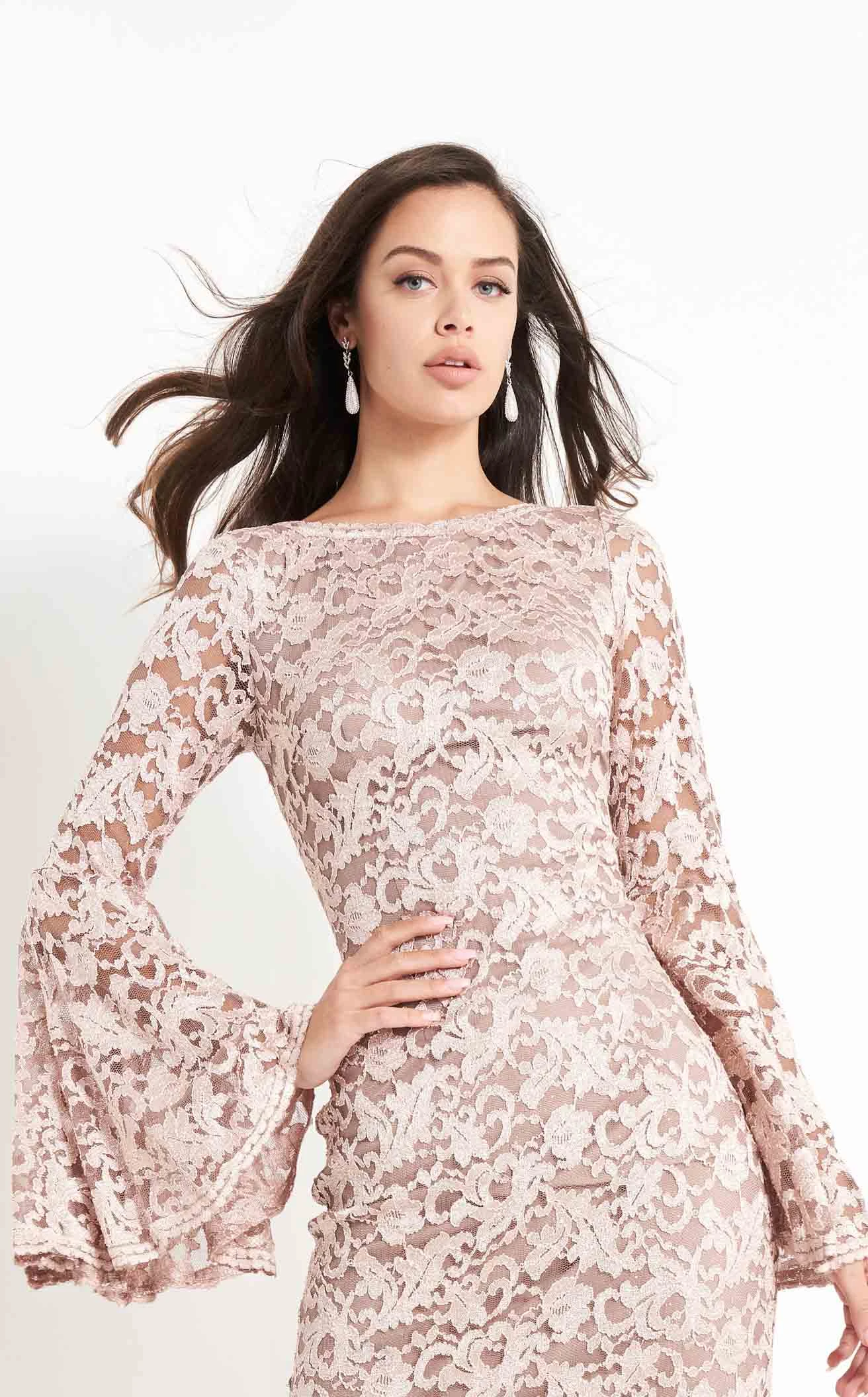 Look superb in Jovani 03351 Dress. This beautiful item features a column silhouette and lace & embroidery. The long sleeve bodice has a high neckline neckline and a natural waist.