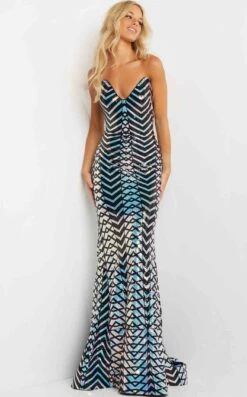 Enter the scene with grace and exquisiteness in this fascinating dress from Jovani 07285. This multi-colored dress is embellished with sequins all over and features a strapless V-neckline. The outfit reveals your sexy figure in its form-fitting silhouette and mid-rise back. The skirt with a horsehair hem finishes with a sweep train.