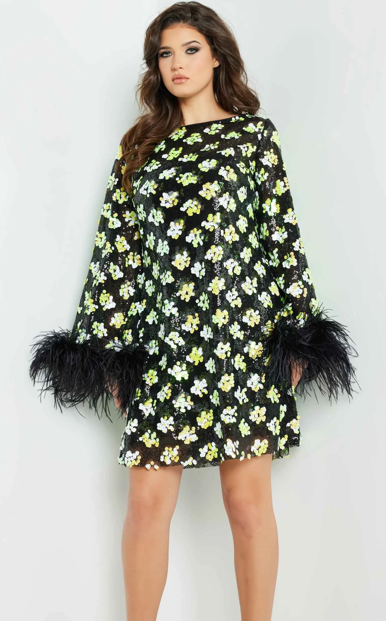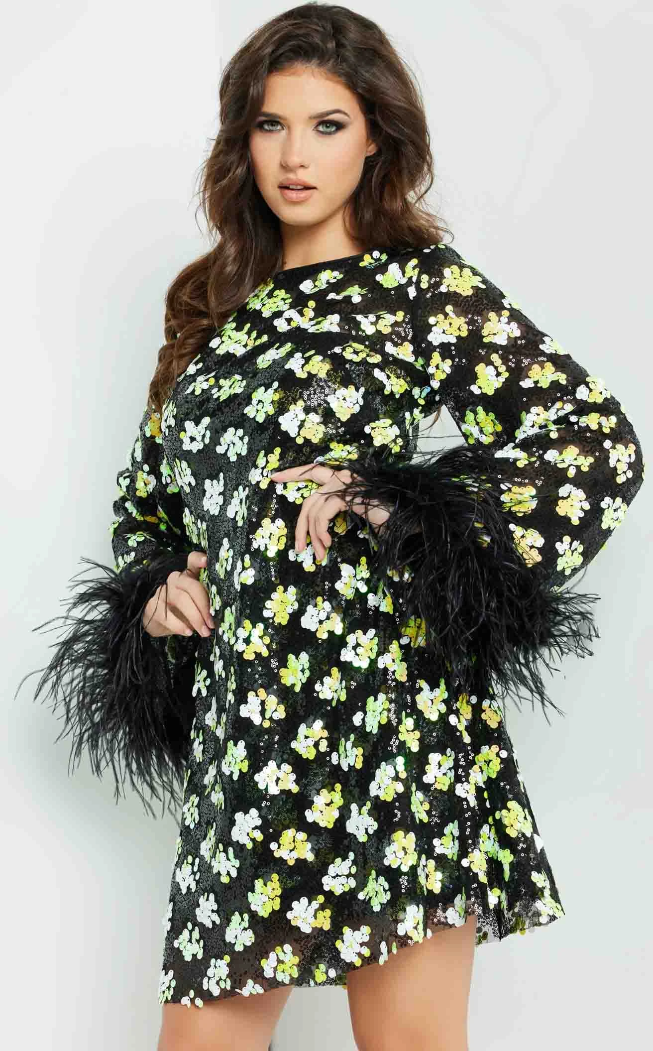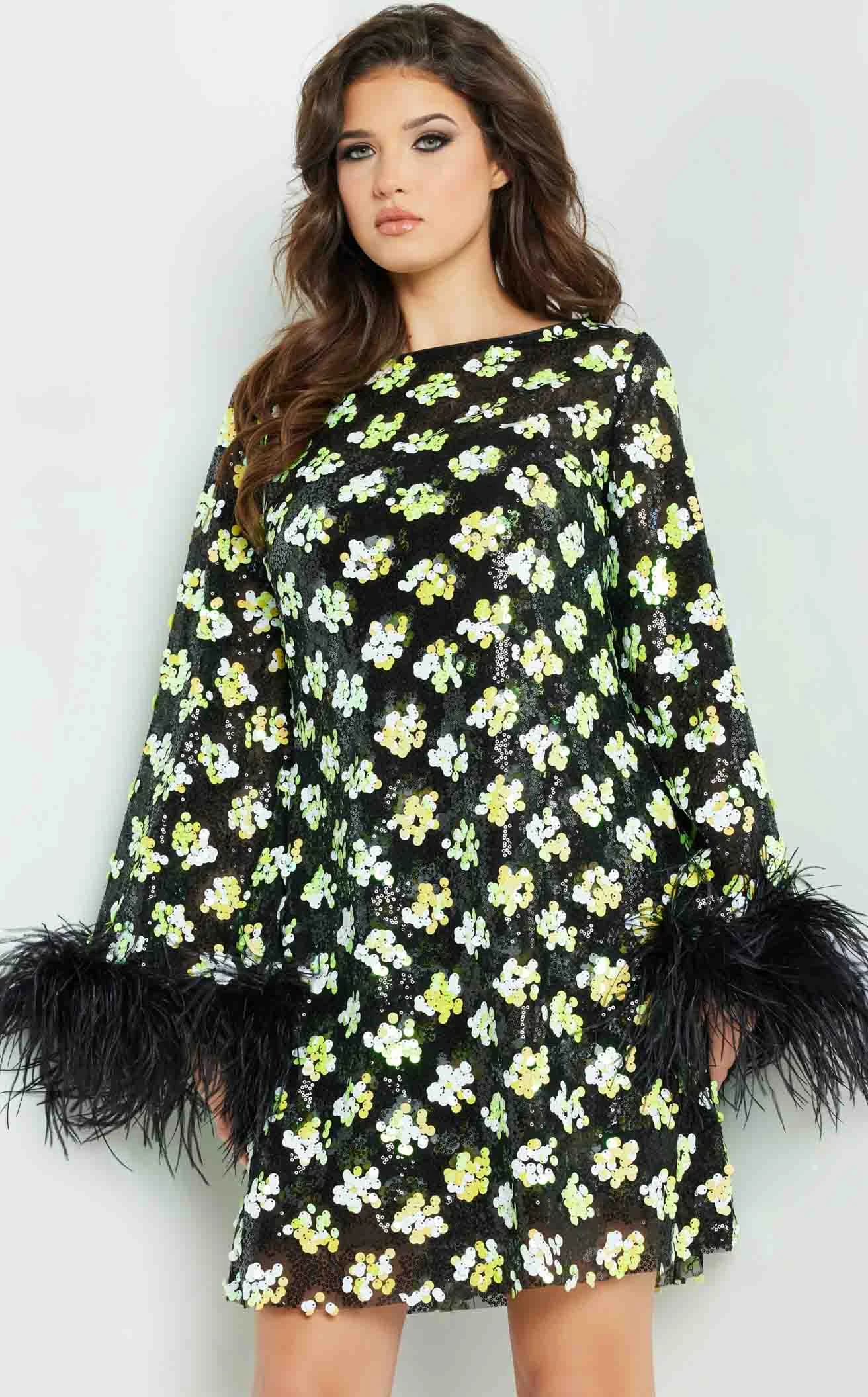 Jovani 220760 is a fun dress that is ideal for a funky party. It has long sleeves with fringe lace cuffs. This dress is a must-have for those who prefer a shorter, more daring look. The boat neckline defines the dress’s style and its snug fit allows you to move freely.