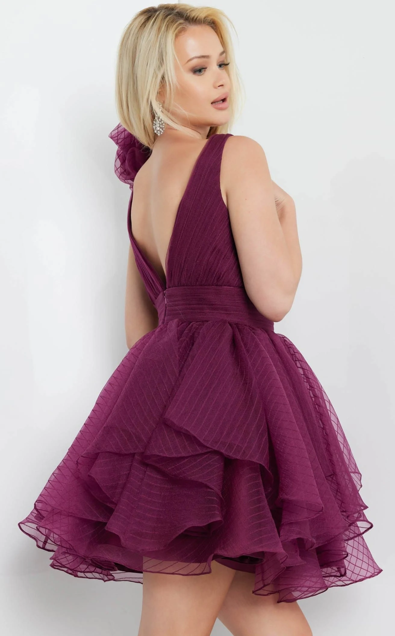 Take a glance at your mesmerized beauty wearing this beautiful A-line Jovani 22279 dress. It has a plunging V-neckline with thick banded waist construction. Adored with pleats, this striped organza dress has a sleeveless design and large ruffled detail along the shoulder. It has a short-length silhouette with the skirt featuring flowy asymmetrical flounces.
