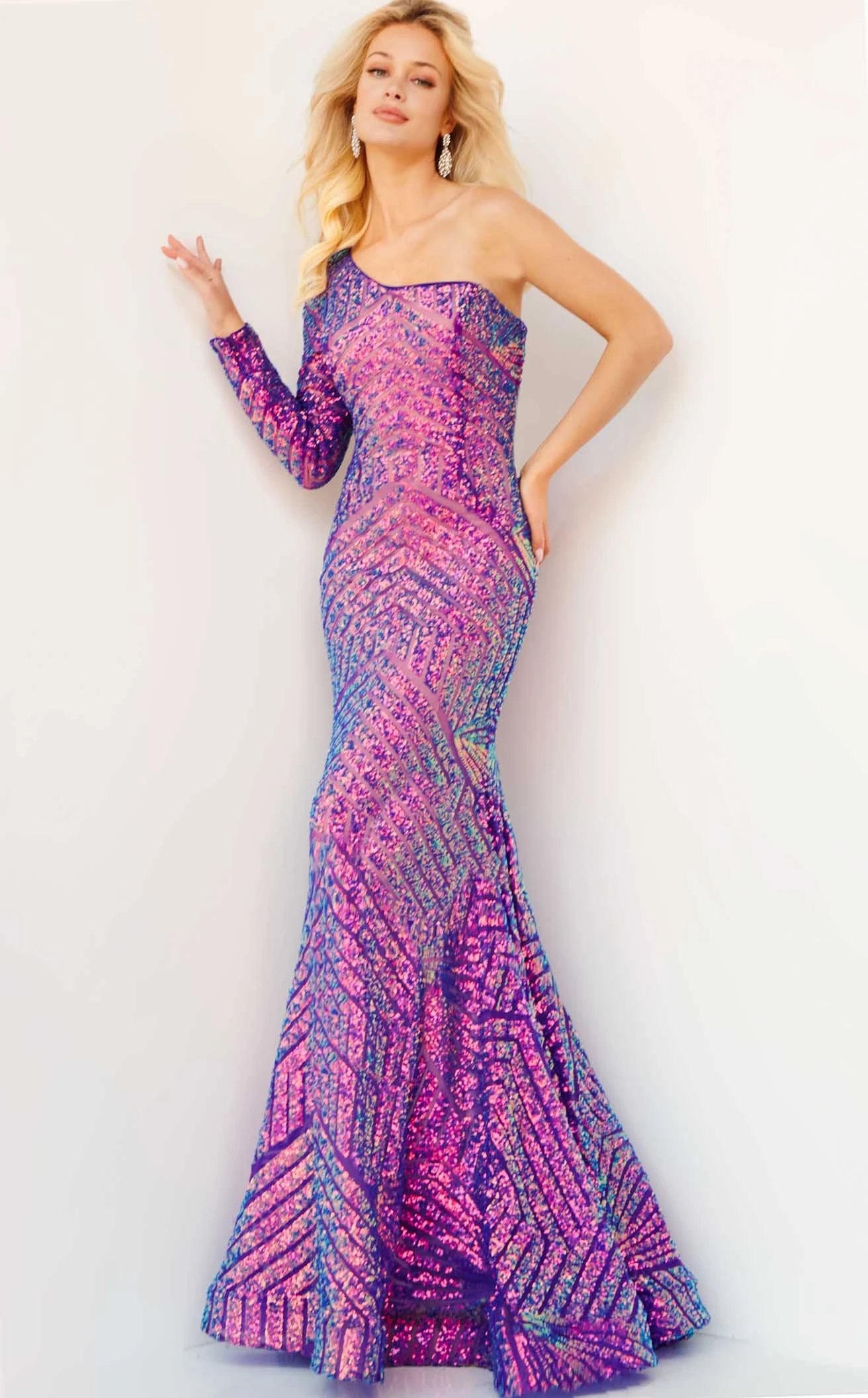 This beautiful prom dress from Jovani 24098 allows you to dazzle all night long. This outfit is encased in a geometric pattern of sequins and features an asymmetrical neckline and a one-shoulder long sleeve. The slanted mid-open back has a central zipper closure for a custom fit. The mermaid skirt flows nicely to a full-length hem and is finished with horsehair trim.