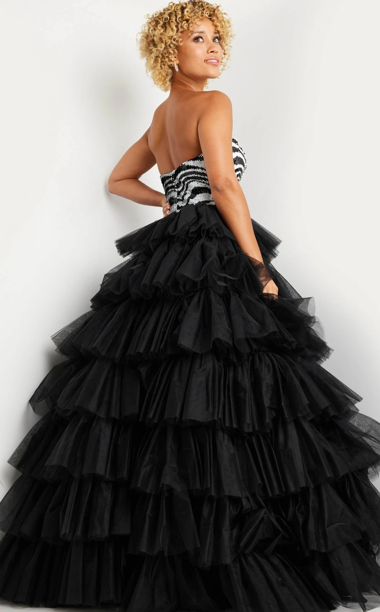 Feel like a modern-day princess with this 38360 dress by Jovani. The sweetheart neckline and strapless design create a flattering silhouette, while the fully embellished torso adds a touch of glamor and sparkle. The ruffle layered tulle A-line skirt adds a playful and feminine touch to the dress, making it perfect for dancing the night away. The A-line silhouette is absolutely voluminous.