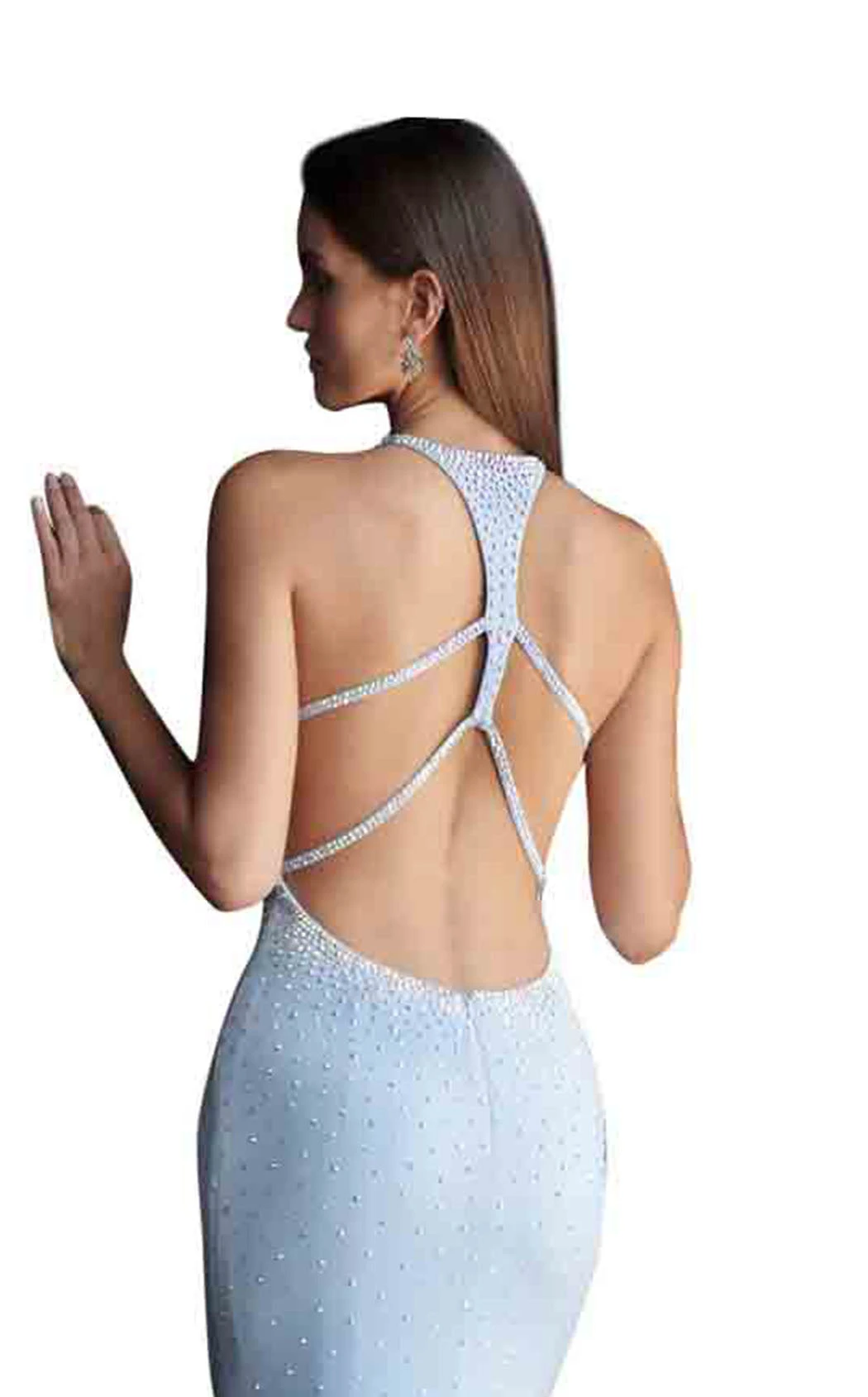 Keyhole halter neck evening gown designed by Jovani.Boast your curves and tasteful fashion-sense with this trumpet gown by Jovani. Featuring a keyhole halter neck with racer back, this dress looks entrancing. Its figure-flattering silhouette flares a little from around the knees and flows uninterrupted till the floor. Smooth, plain finish of the dress is accentuated by beads to tone up the final look.