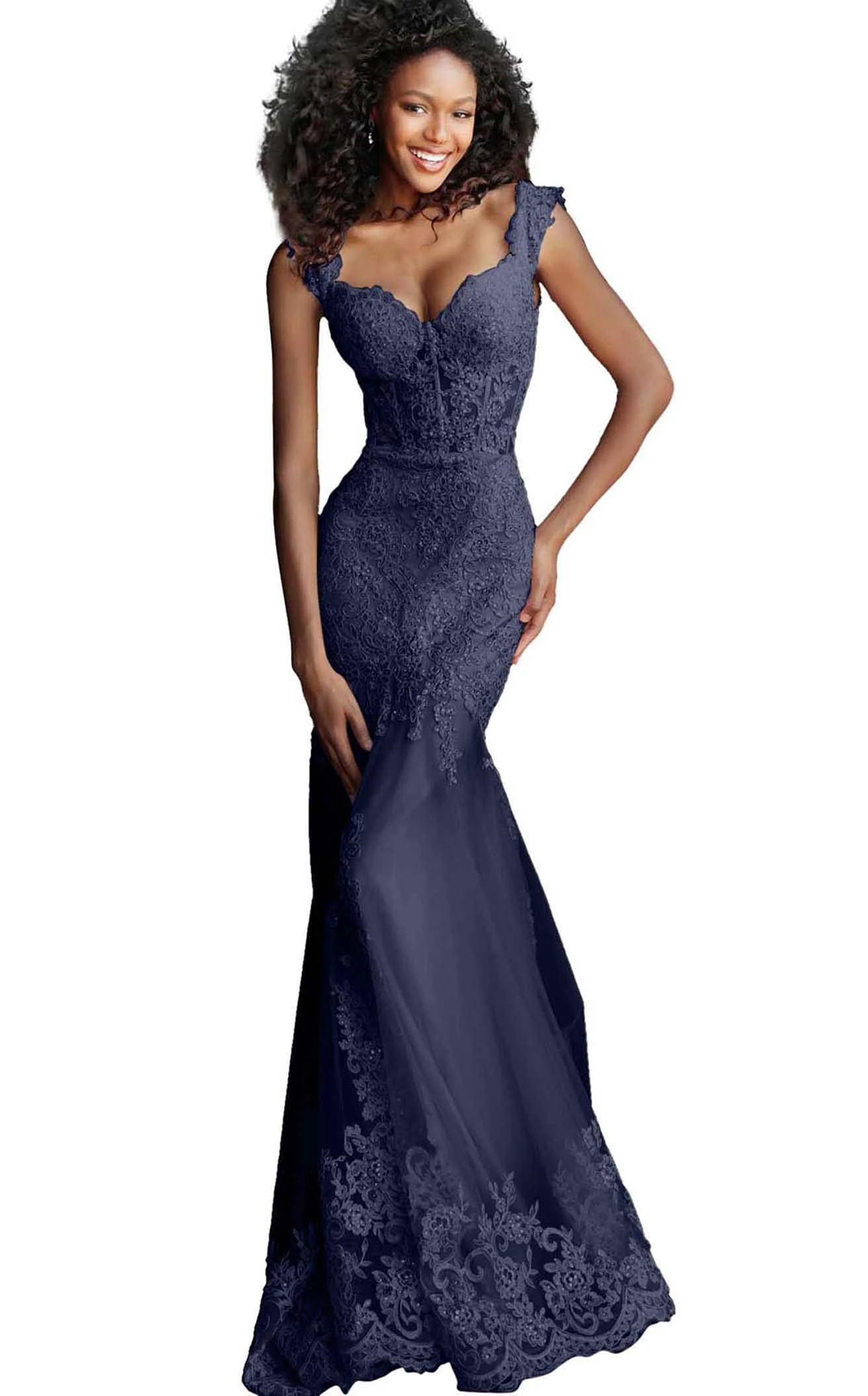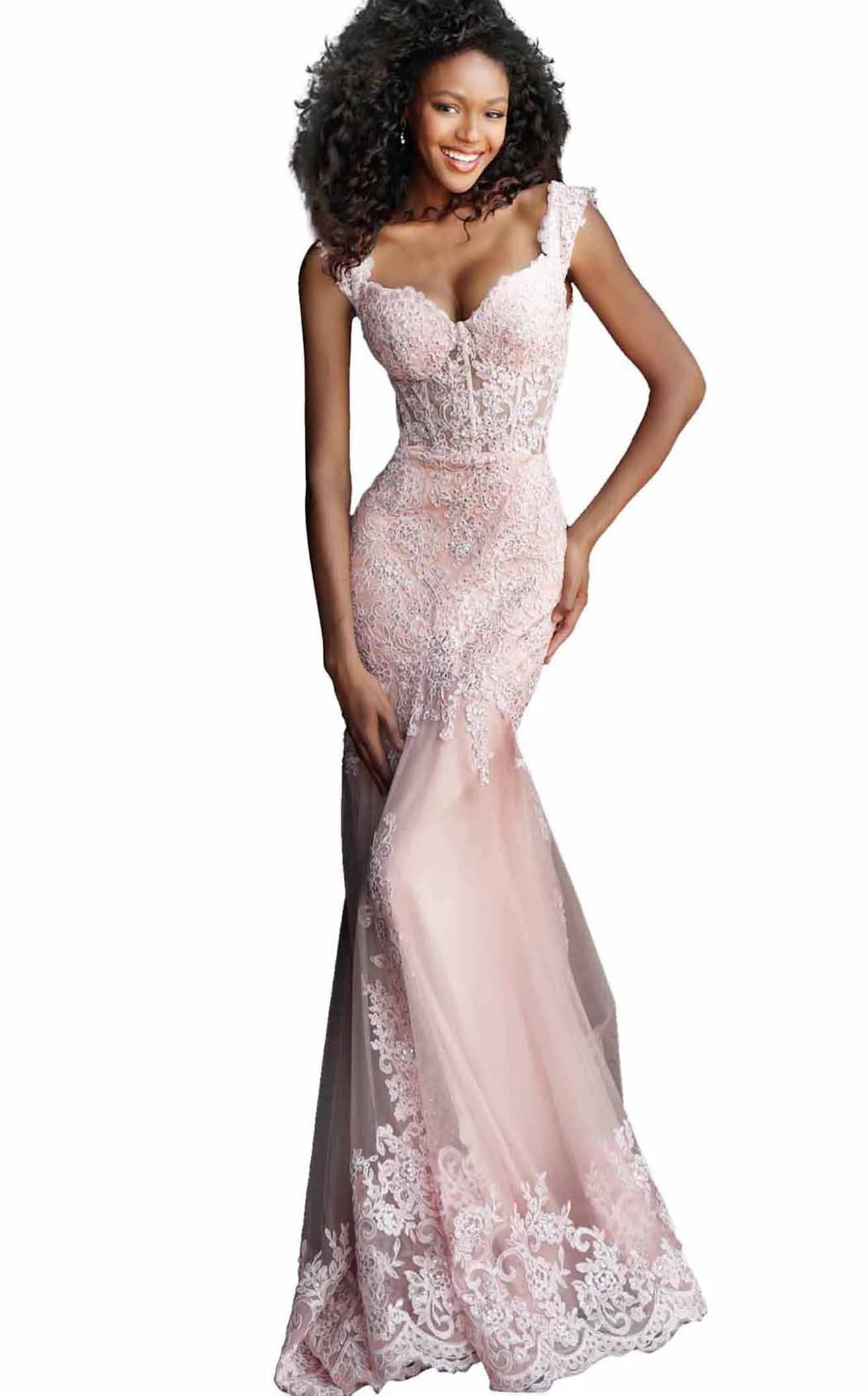 Trumpet gown with embroidered corset bodice from JVN JVN65688 by Jovani JVN65688 Exude elegance with your looks by wearing this trumpet gown from JVN from Jovani. Featuring a sweetheart neckline and a sleeveless sheer corset bodice, this gown highlights your curves. The embellishments and the embroidery run all around the bodice up to the mid-thighs and find their way again at the flared end of the sheer overlay skirt.