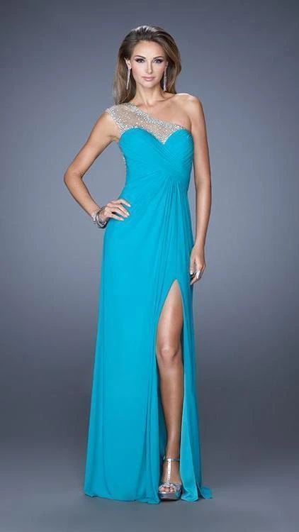 Look Dazzling in this La Femme 20384 Dress by La Femme. This dress features Asymmetrical, blackfriday19, Column, eoy2019, Glittering Accents, july4, Long, Natural, New, Prom Dresses, prom_dresses, Short Sleeve, Yes