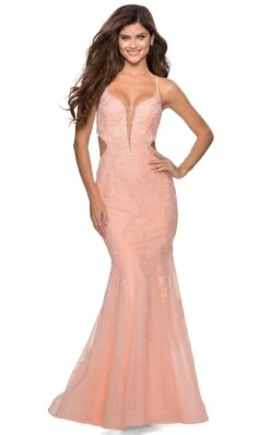 Look Dazzling in this La Femme 21052 Dress by La Femme. This dress features blackfriday19, eoy2019, Fit & Flare, la_femme, Lace & Embroidery, Long, Natural, New, No, Prom Dresses, prom_dresses, Sleeveless, V-Neck