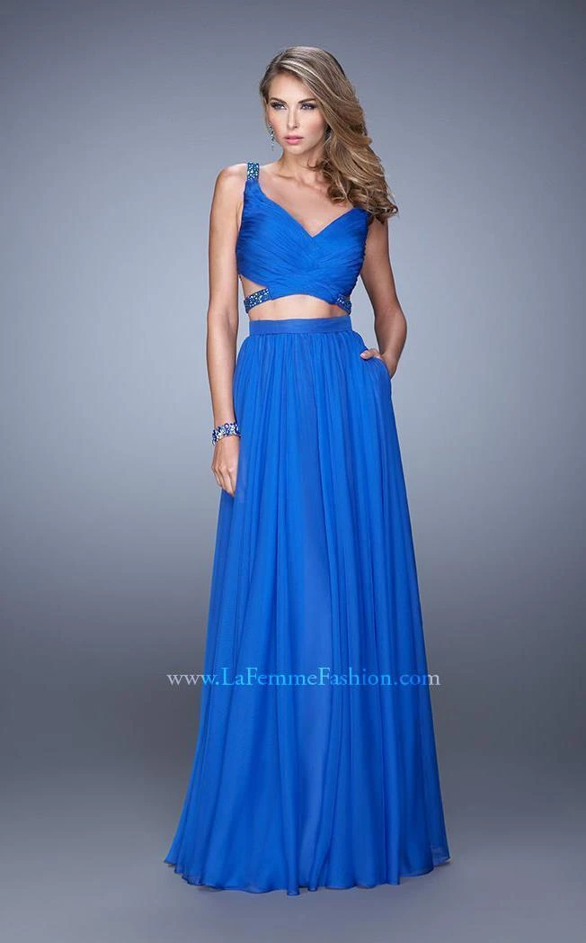 Look Dazzling in this La Femme 21152 Dress by La Femme. This dress features A-Line, as_seen_in, blackfriday19, eoy2019, Glittering Accents, la_femme, Long, Natural, New, No, Prom Dresses, prom_dresses, Sleeveless, V-Neck
