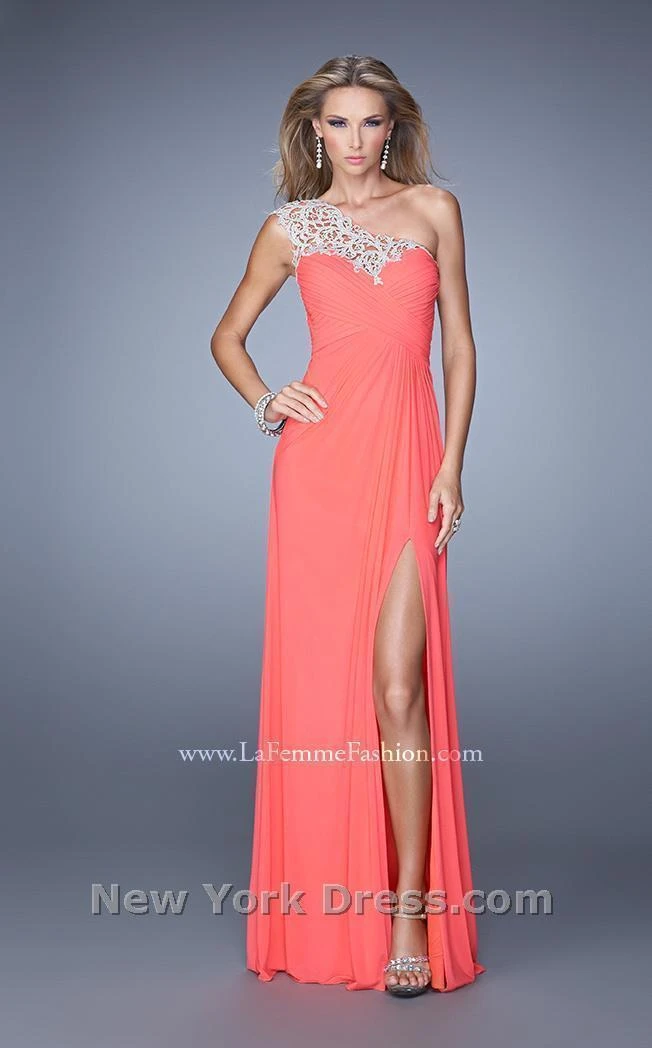 Look Dazzling in this La Femme 21219 Dress by La Femme. This dress features Asymmetrical, blackfriday19, Column, eoy2019, la_femme, Lace & Embroidery, Long, Natural, New, Prom Dresses, prom_dresses, Sleeveless, Yes