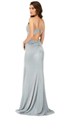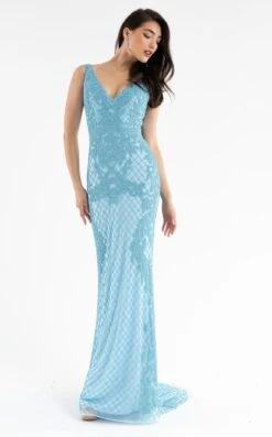 Look Dazzling in this La Femme 21294 Dress by La Femme. This dress features blackfriday19, Column, eoy2019, Lace & Embroidery, Long, Natural, New, No, Short Sleeve, V-Neck
