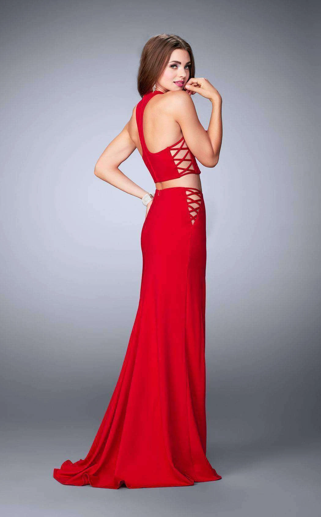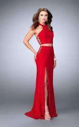 Strike a pose in this two-piece evening gown from La Femme 23984. The cropped top has a high neckline and lace-up detail at both sides. The midriff is exposed. The matching skirt is flanked with lace-up detail. The column silhouette has a slit at one side and finishes with a full length hem.
