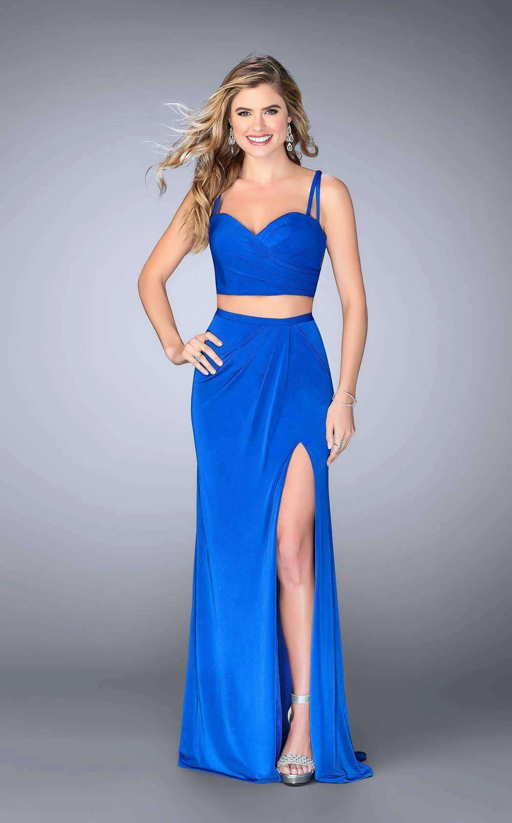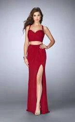 Look amazing for the party in this two-piece evening gown from La Femme 24007. The cropped top has delicate straps and a pronounced sweetheart shape. The structured bodice has fine ruching throughout and the midriff is exposed. The matching skirt boasts a high waist with gentle movement. This gown finishes with a full length hem.