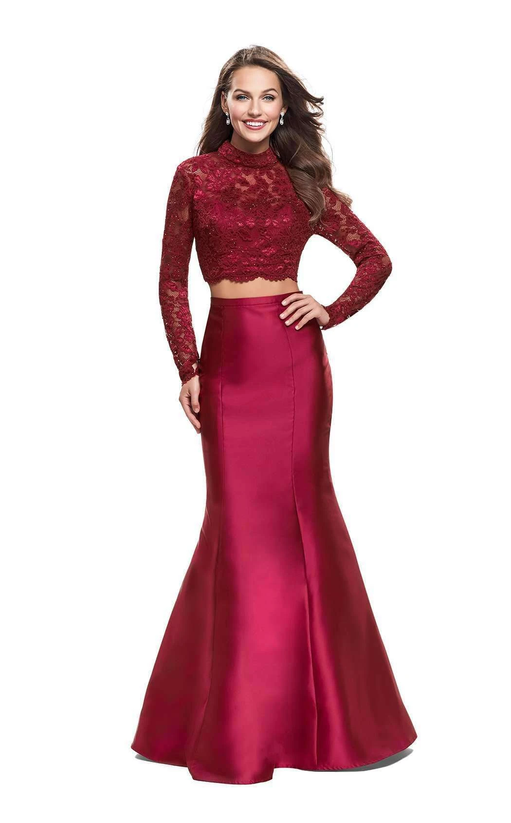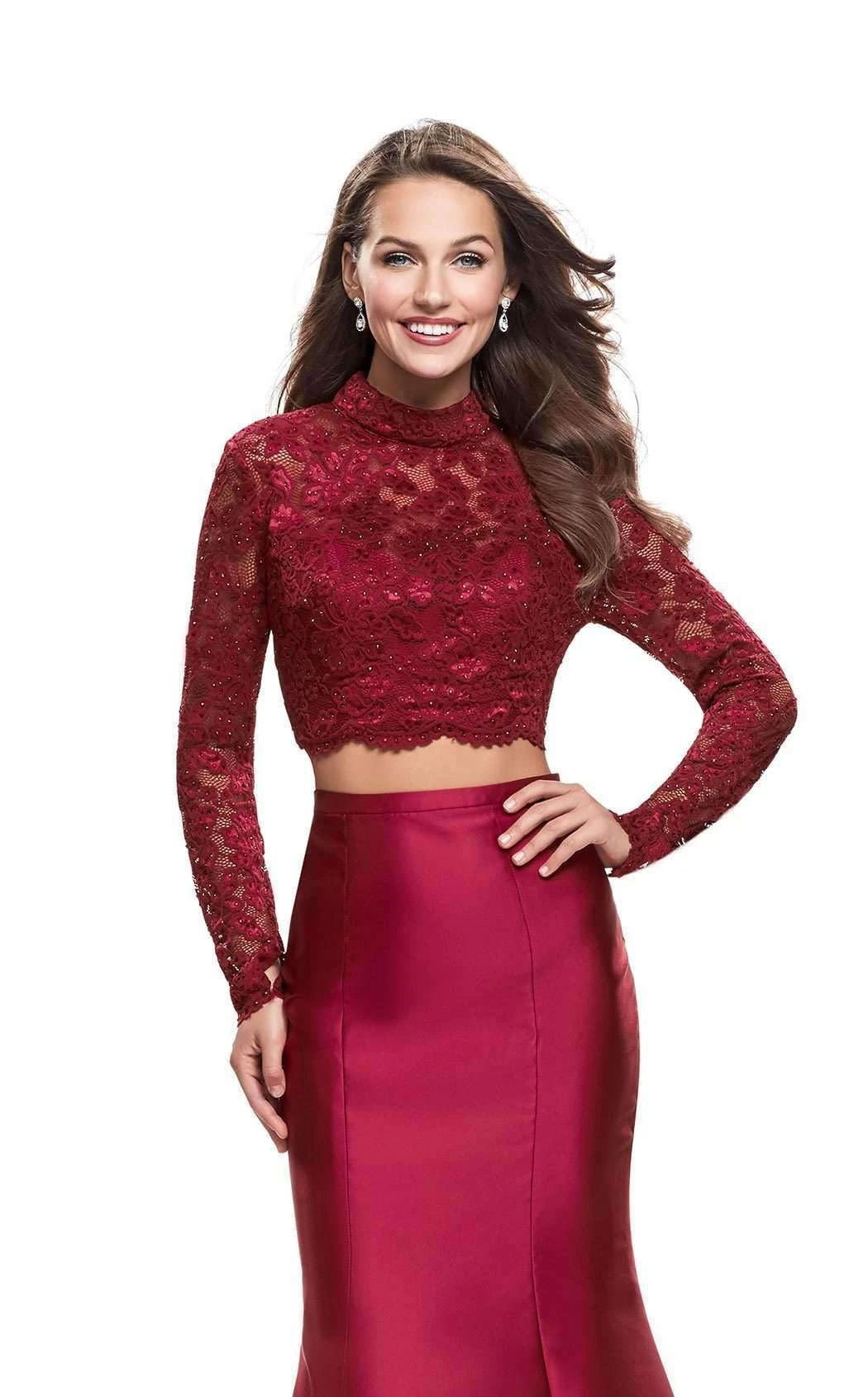 It’s time to make waves in this trendy two-piece evening gown from La Femme 24901. The cropped top has a high neck with long sleeves and rich lace overlay throughout. The midriff is exposed. The coordinating skirt has a high waist. The skirt is smooth with a flared shape and finishes with a full length hem.