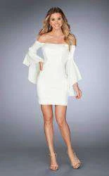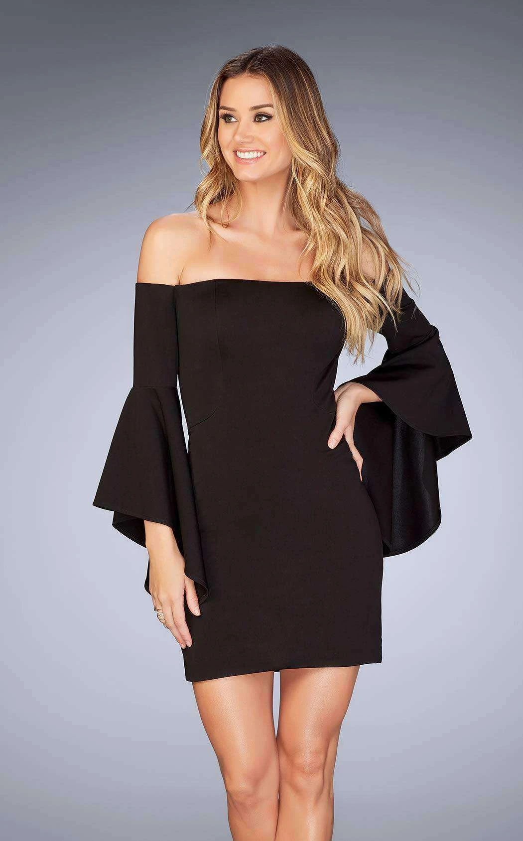 You glow in a fab dress from La Femme 25033. This fab design features an off-shoulder neckline with flared long sleeves for a dramatic effect. The bodice is gently lined to flatter your figure. The mini-skirt hem is fitted at your hips to lengthen your legs and make you stand out in the crowd.
