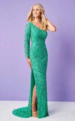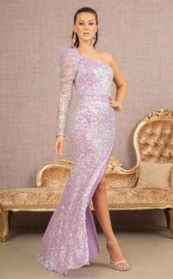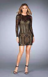 Go glam in a magical dress from La Femme 25289. Illusion fabric creates a bateau neckline with a long sleeve effect. This glossy design is lacy down the length to showcase an artistic array of accents. The shift dress design is flattering to your figure and ends in a mini-dress hem.