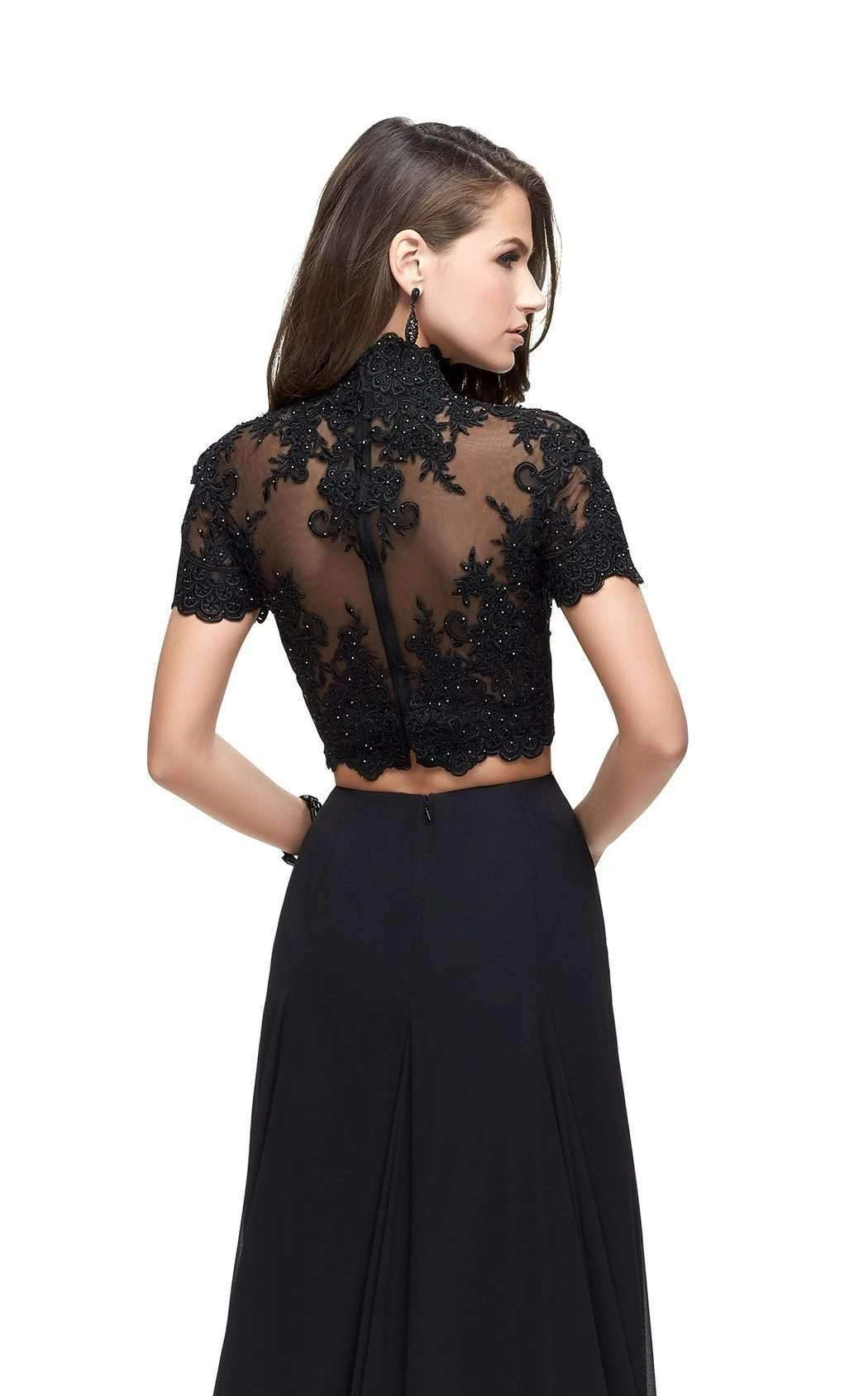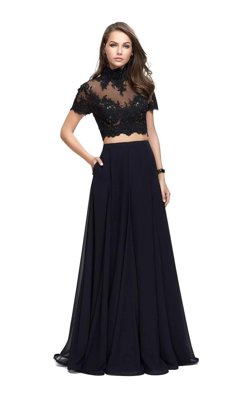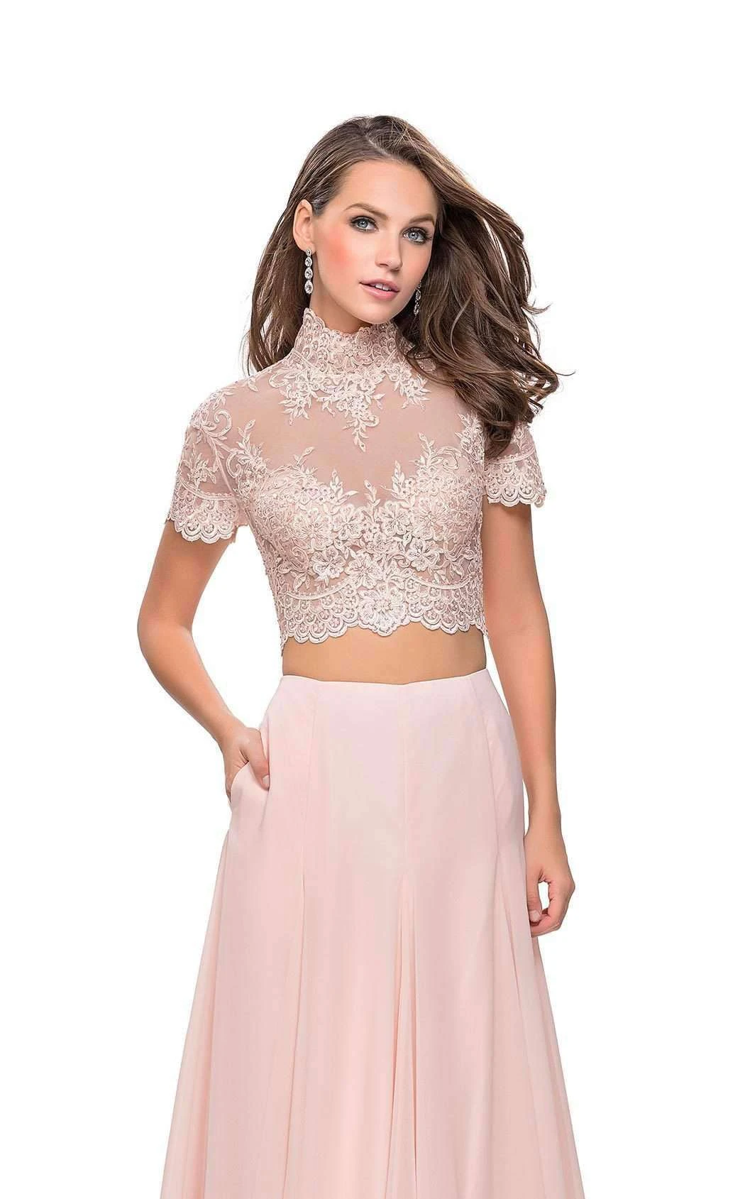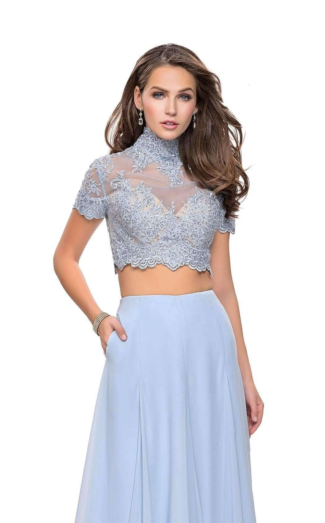 Have your red carpet moment in this two-piece evening gown by La Femme 25401. The cropped top has a high neckline with cap sleeves. The upper portion is sheer with lace overlay throughout the fitted bodice. The midriff is exposed. The coordinating skirt has a soft A-line shape and finishes with a full length hem.