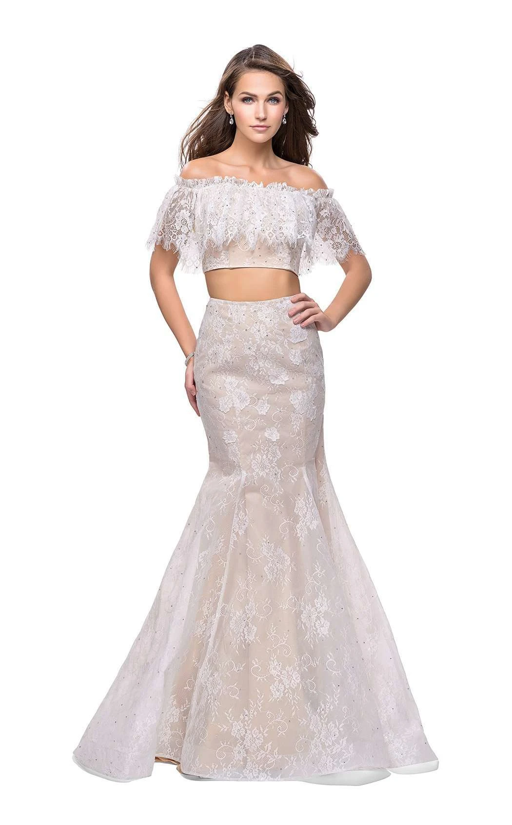 Go for pure luxury in this La Femme 25417 two-piece evening gown. The cropped top is off-the-shoulder with lace overlay throughout. The midriff is exposed. The matching skirt has a high waist with a flared A-line skirt. This gown finishes with a full length hem.