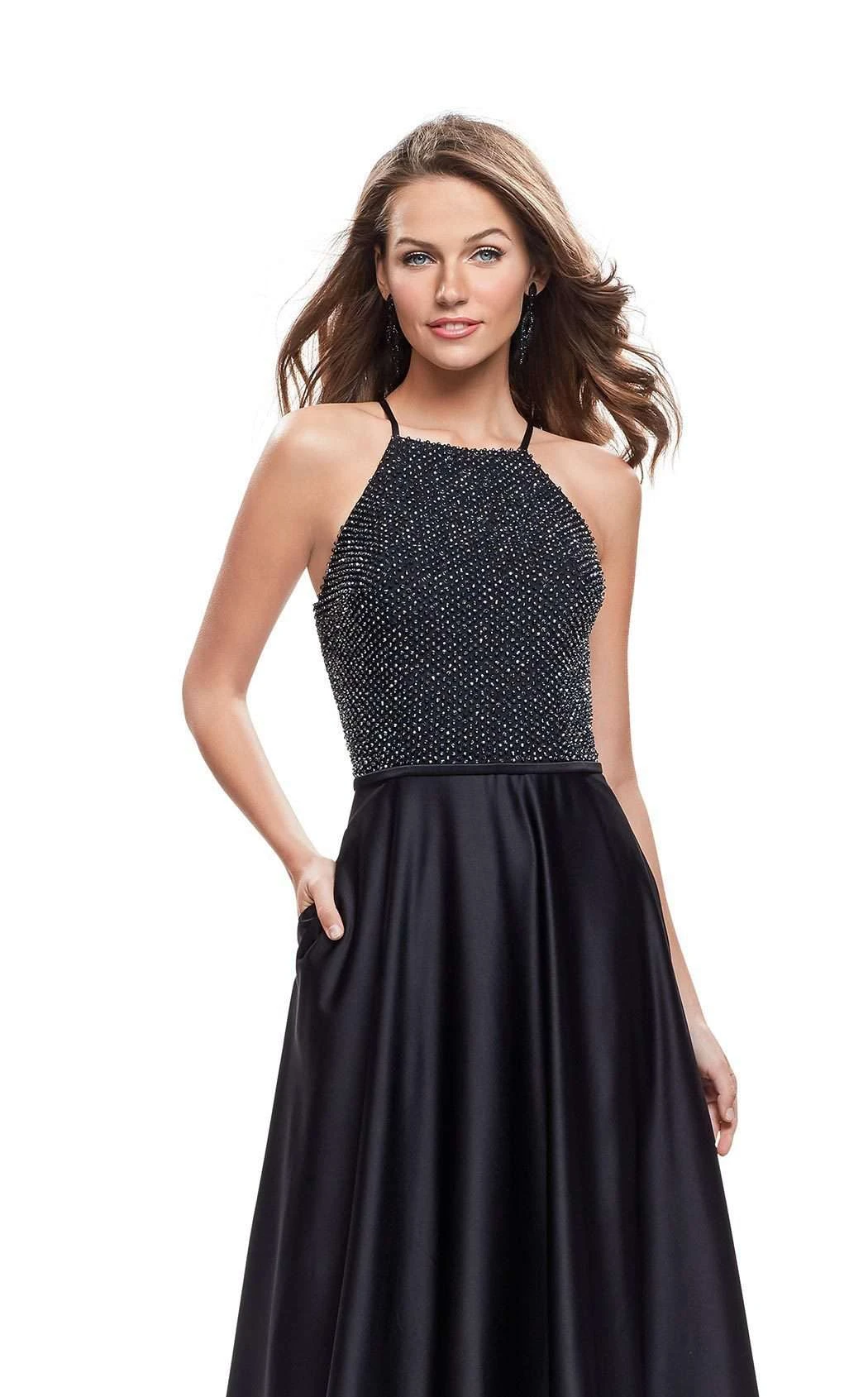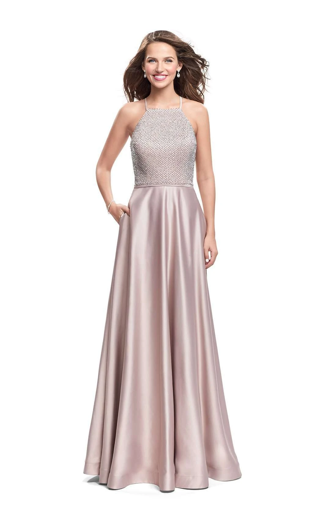 Ensconce yourself in glamorous glints with this luminous evening gown by La Femme 25601. Delicate straps secure the halter bodice at the neck while streams of shimmer highlight a precision fit along bust and midriff. A silken band encircles the waist, and in-seam pockets grace the hips. The contrasting skirt ripples in soft, silken folds to a flared finish at full-length.