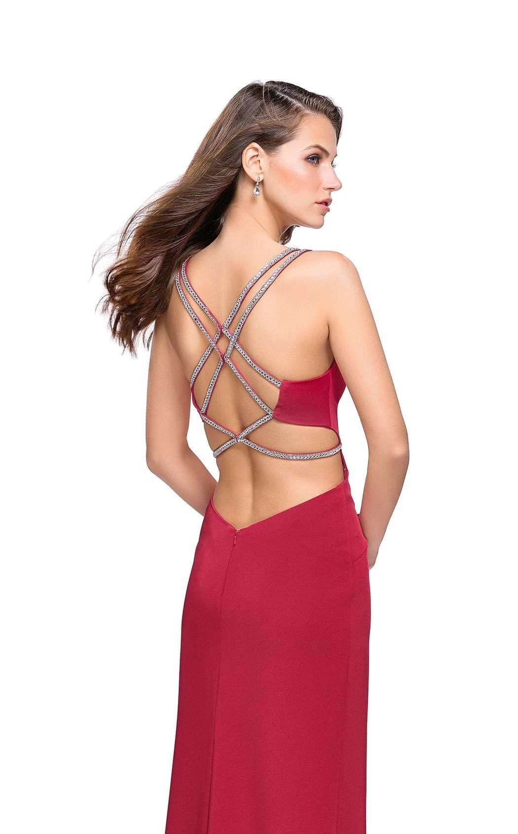 Dress for a distinctive effect in this impactful formal by La Femme 25623. The sleeveless bodice boasts wide-set shoulder straps and a pretty plunge along the center front. Tailoring lines trace the curves of bust, waist and hips to fashion an iconic silhouette while a sultry side split accents the skirt. A fetching flare forms a subtle ripple at full-length.