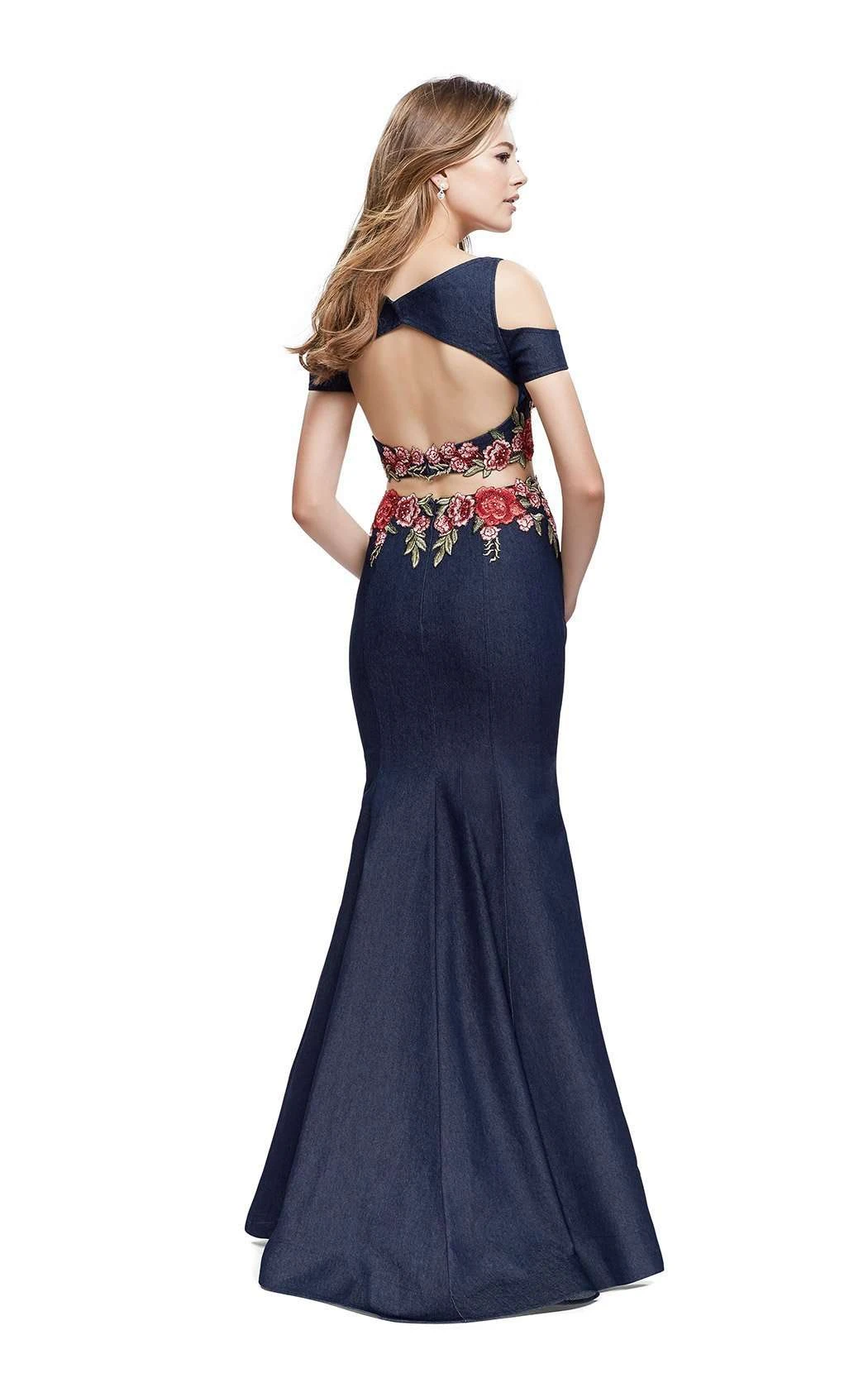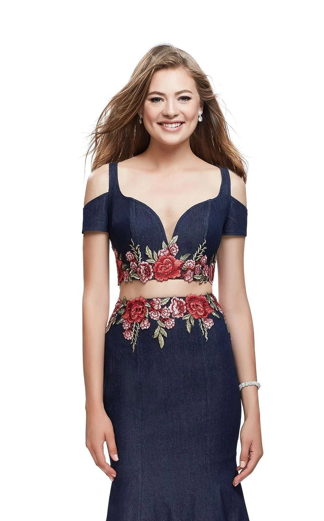 Revel in the romance of this petal-pretty formal set by La Femme 25848. Shoulder straps secure the off-the-shoulder neckline and slender bands accent the upper arms. Floral appliques adorn the cropped bodice and the waist of the matching skirt, framing the bare midriff. A trim fit along curvy hips sluices to a fluted finish at the flared full-length.