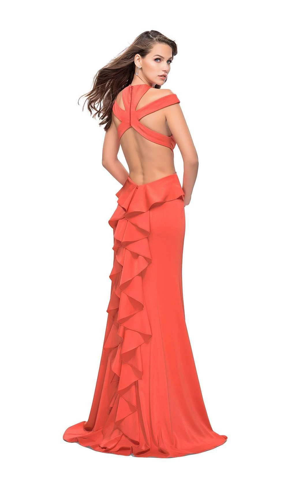 Become a patron of the arts in this artisan evening gown by La Femme 25971. The sleeveless bodice features a bib-style strap plus bands that span the shoulders and back. Sectional construction creates a dazzling fit along the curves of bust and midriff. Wedge-shaped cutouts accent the sides of the waist, and a sensuous split adorns the skirt. A graceful flute falls to flutters at full-length.