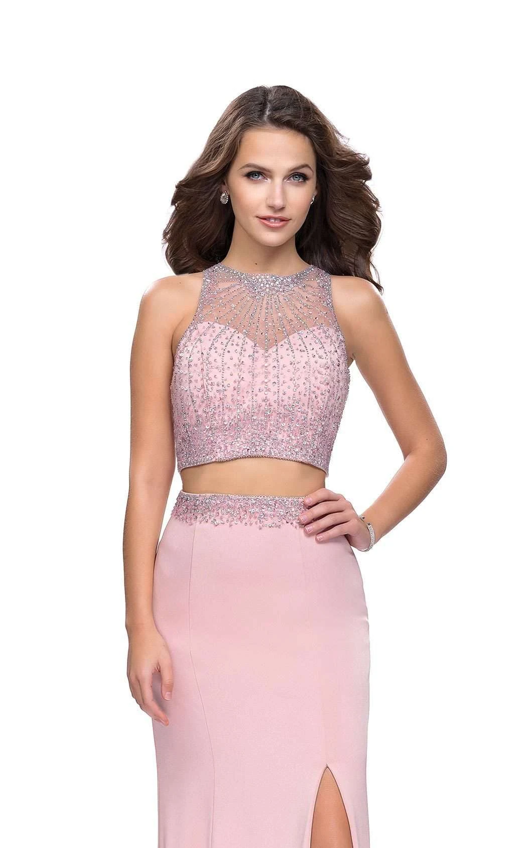 Illuminate your upscale event in this shimmer-trimmed formal set by La Femme 26063. The sheer bodice features a jewel neckline and cutout shoulders. Trim lines trace a curvy fit, and strapless lining provides pretty contrast. Radiant lines sparkle with light from neck to cropped midriff. Stunning glints debut the sculpted skirt, and a side split accents the fluted full-length.