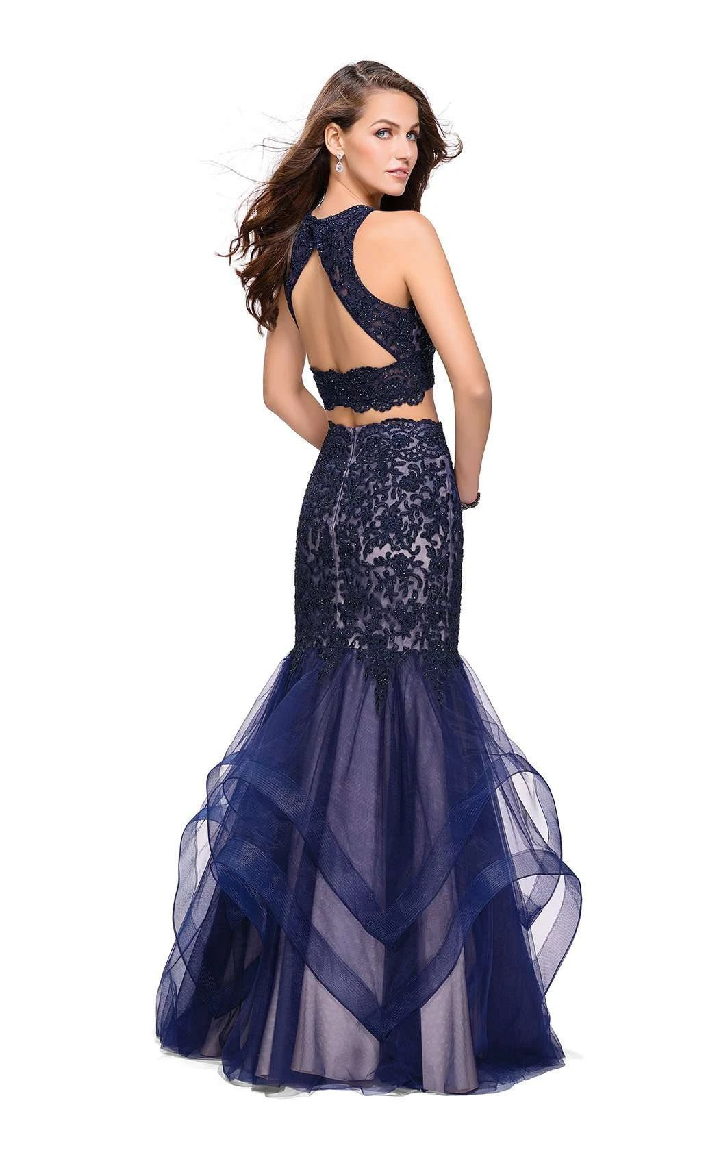 Stay a step ahead of the latest trends in this avant-garde evening set by La Femme 26071. The sheer, sleeveless bodice features a curve-friendly fit and tonal appliques at the neckline, bust and cropped midriff. Contrasting strapless lining provides coverage and depth. Scalloped edging debuts the matching skirt, and a contrasting flounce forms a dramatic full-length. A pair of sheer ruffles adds a finishing flourish.
