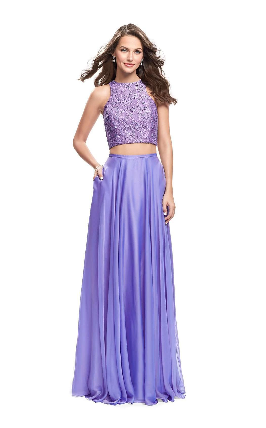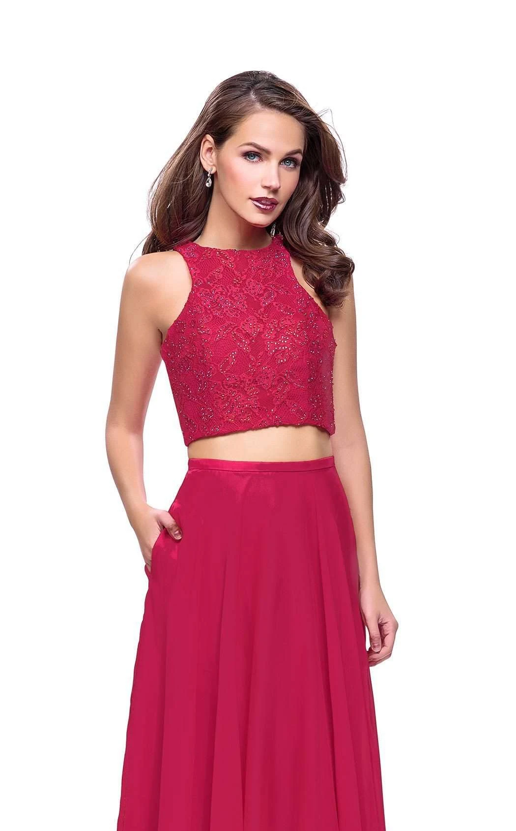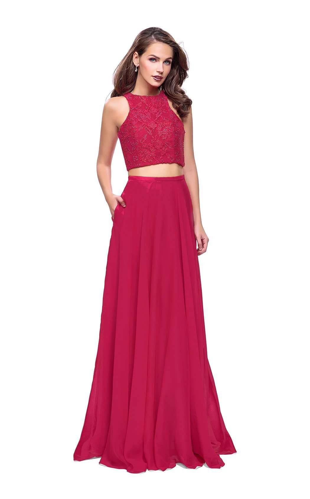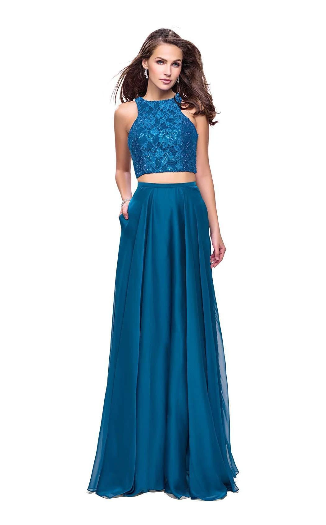 Go with the flow of your formal event in this lithe evening set by La Femme 26087. The halter bodice features a jewel neckline and trim lines that trace a curvy silhouette. Cropped styling reveals the midriff, and a silken band debuts the sheer-layered skirt at the waist. In-seam pockets accent the hips, and lithe ripples rill to a lush finish at the feet.
