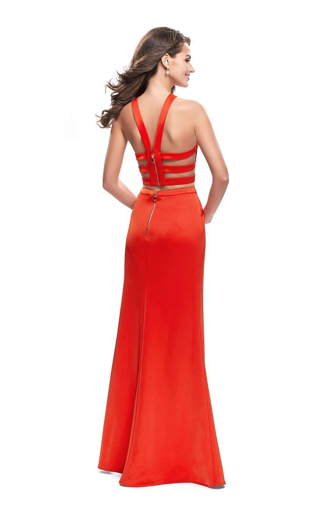 Put pizazz in your upcoming event in this strappy formal set by La Femme 26171. A V-shaped strap secures the halter-style bodice at the neck, and sectional lines trace a curve-friendly fit. Triple straps accent the bare upper back, and cropped detail reveals the midriff. The matching skirt streams, beside a snazzy split, to a flared, floor-brushing dénouement.