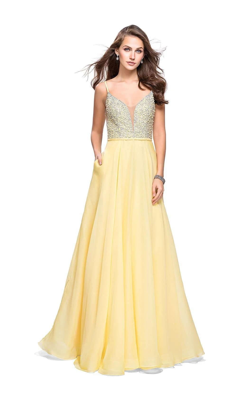 Stir up some nighttime magic in this bewitching evening gown by La Femme 26278. Satiny straps span the shoulders while the plunging V-neckline strikes a sultry note at center front. Translucent wedge-shaped insets accent the sides of the bodice, and shimmery embellishments highlight a curvy fit. The contrasting skirt has a self-fabric waist and hidden pockets at the hips. Lithe layers flare to an airy full-length.