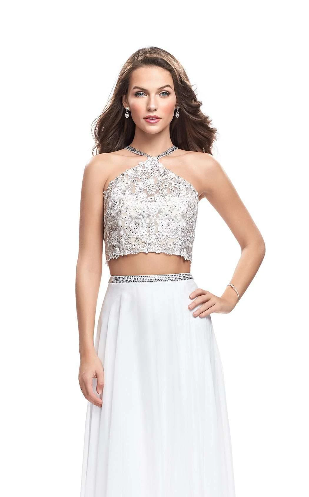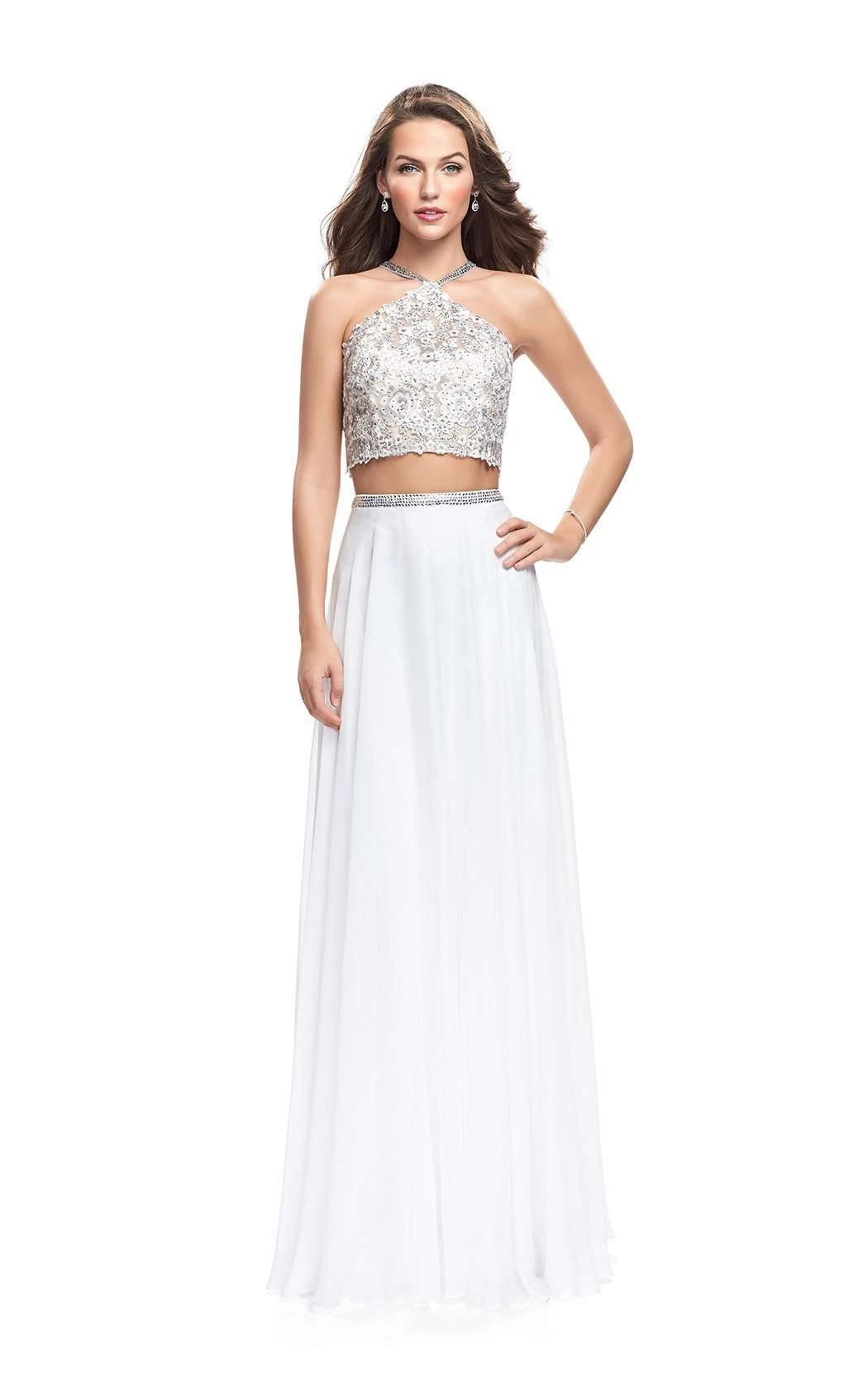 Exhibit a fine eye for fashion in the exquisite formal set by La Femme 26288. A shimmering necklace strap debuts the halter bodice while tailoring lines trace a trim fit. Airy eyelet atop strapless lining creates a layered look, and scalloped edging trims the cropped midriff. A glimmering circlet debuts the contrasting skirt, which wafts in feathery layers to a rippling finish at the feet.
