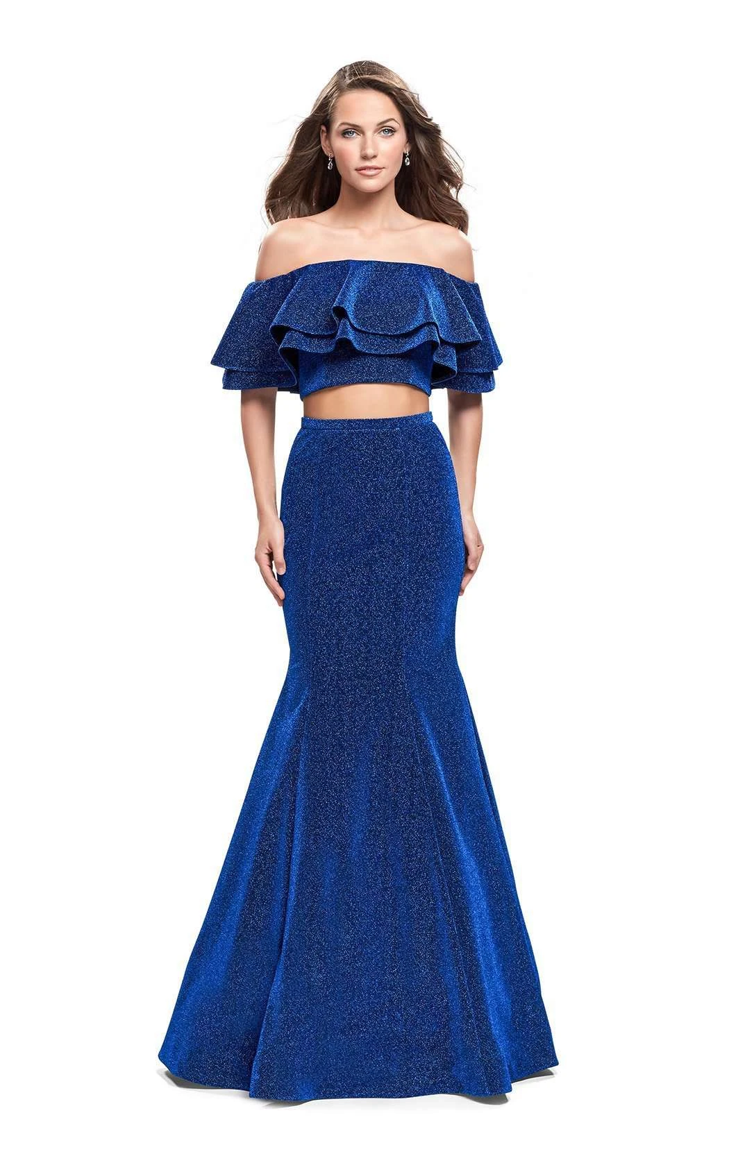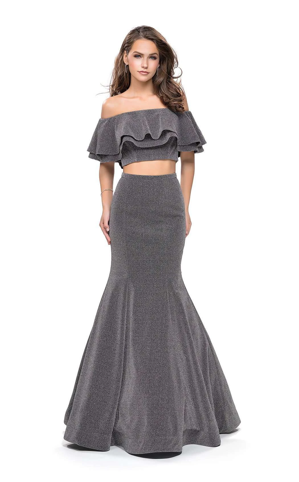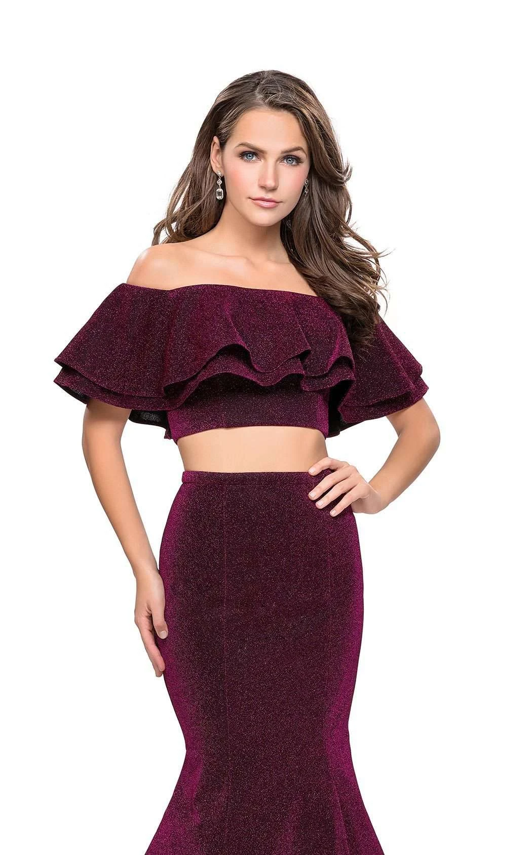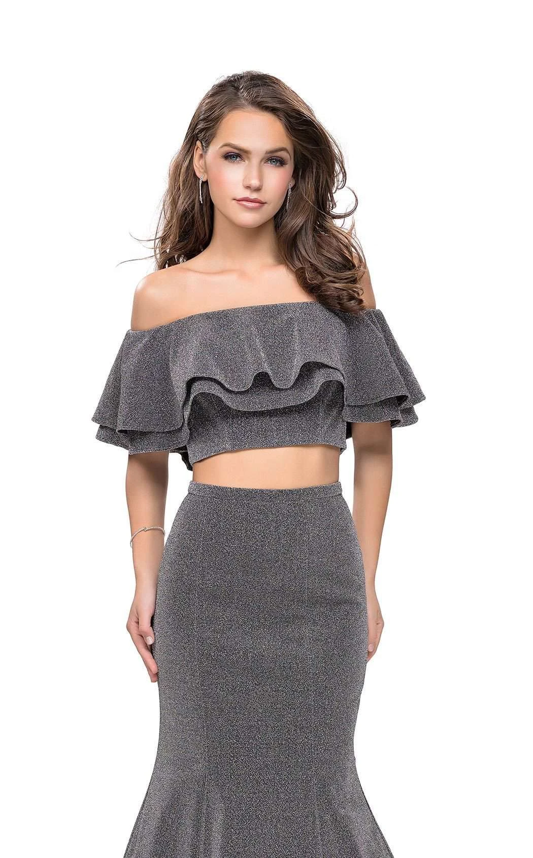 Dance with abandon in this dynamic formal set by La Femme 26324. A dazzling double ruffle accents the off-the-shoulder neckline with exceptional sizzle while the fitted bodice features a simmering cropped midriff. The matching skirt coats the hips in a liquid fit and flutes to a fun splash of flutters at full-length.