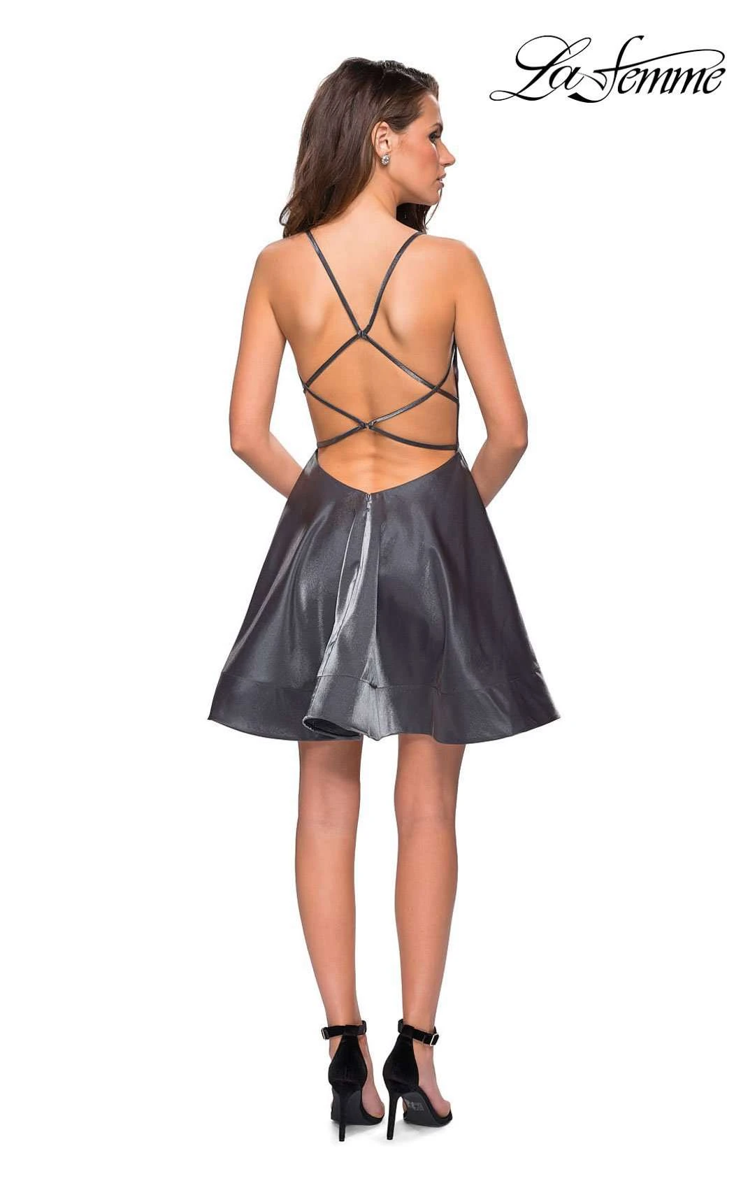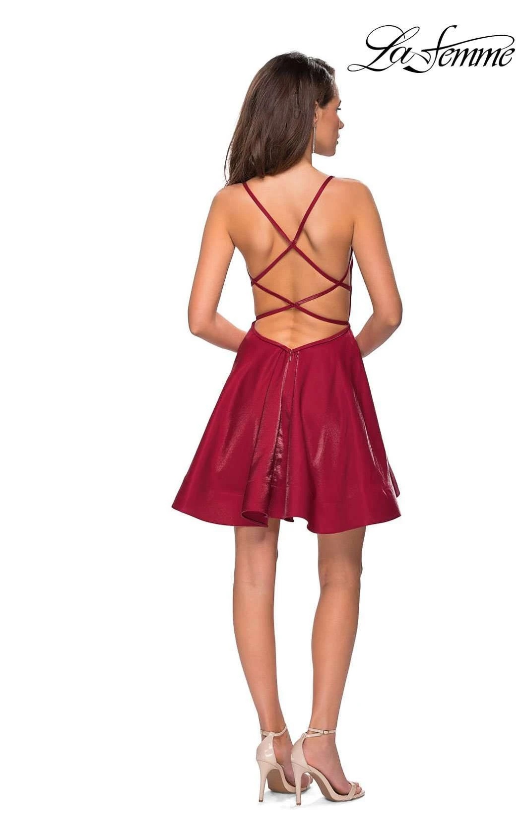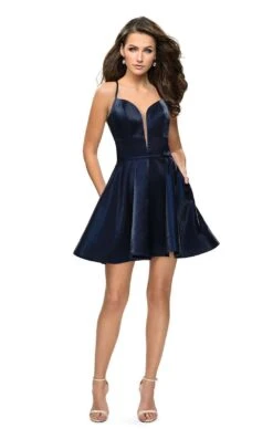Set a sweet tone for your evening in this mellifluous short formal by La Femme 26659. Slender straps span the shoulders while the sweetheart bodice features a sheer inset along the plunge at center front. Sectional seams shape a flawless fit along the bust and midriff, and a self-fabric circlet graces the waist. The bias-cut skirt ripples to a short, flirty hemline.