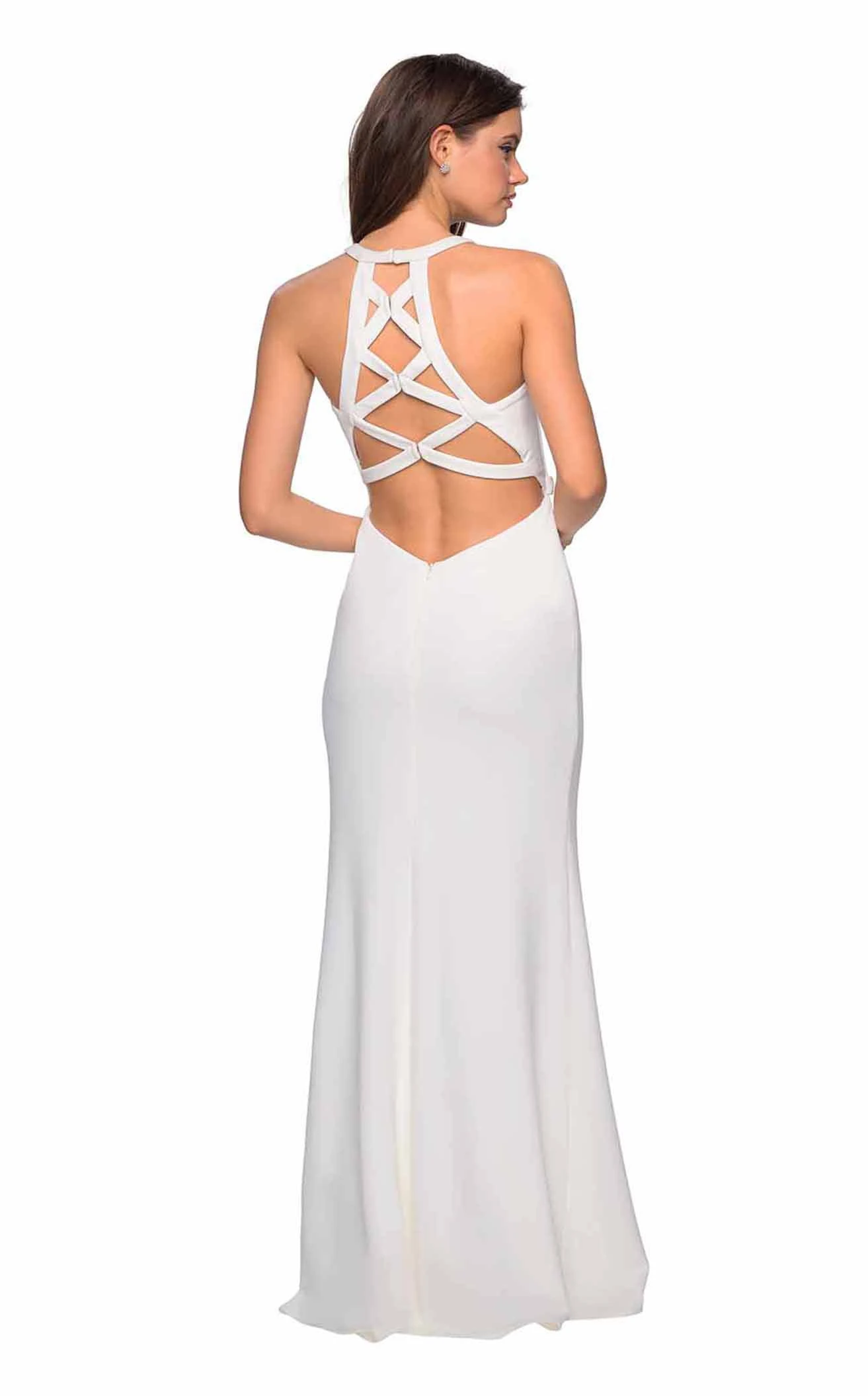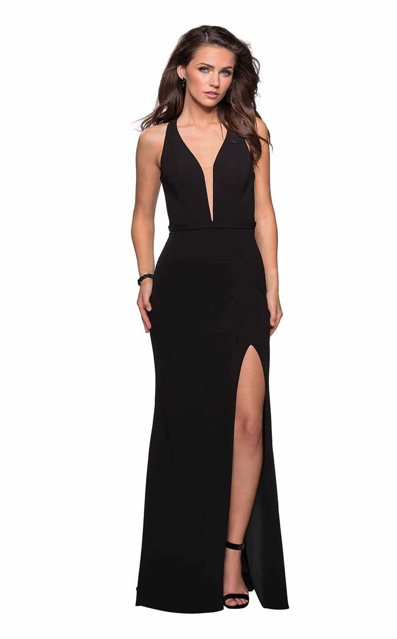 Sheer inset plunging V-halter neck evening dress with a thigh-high slit by La FemmeLook truly remarkable at the upcoming special event in this striking sheath gown designed by La Femme. Its bodice is fitted from the bust to the waist and features a sheer inset plunging V-halter neckline with crisscross strappy back. The skirt traces down the curves into a sweep train with a thigh-high slit.