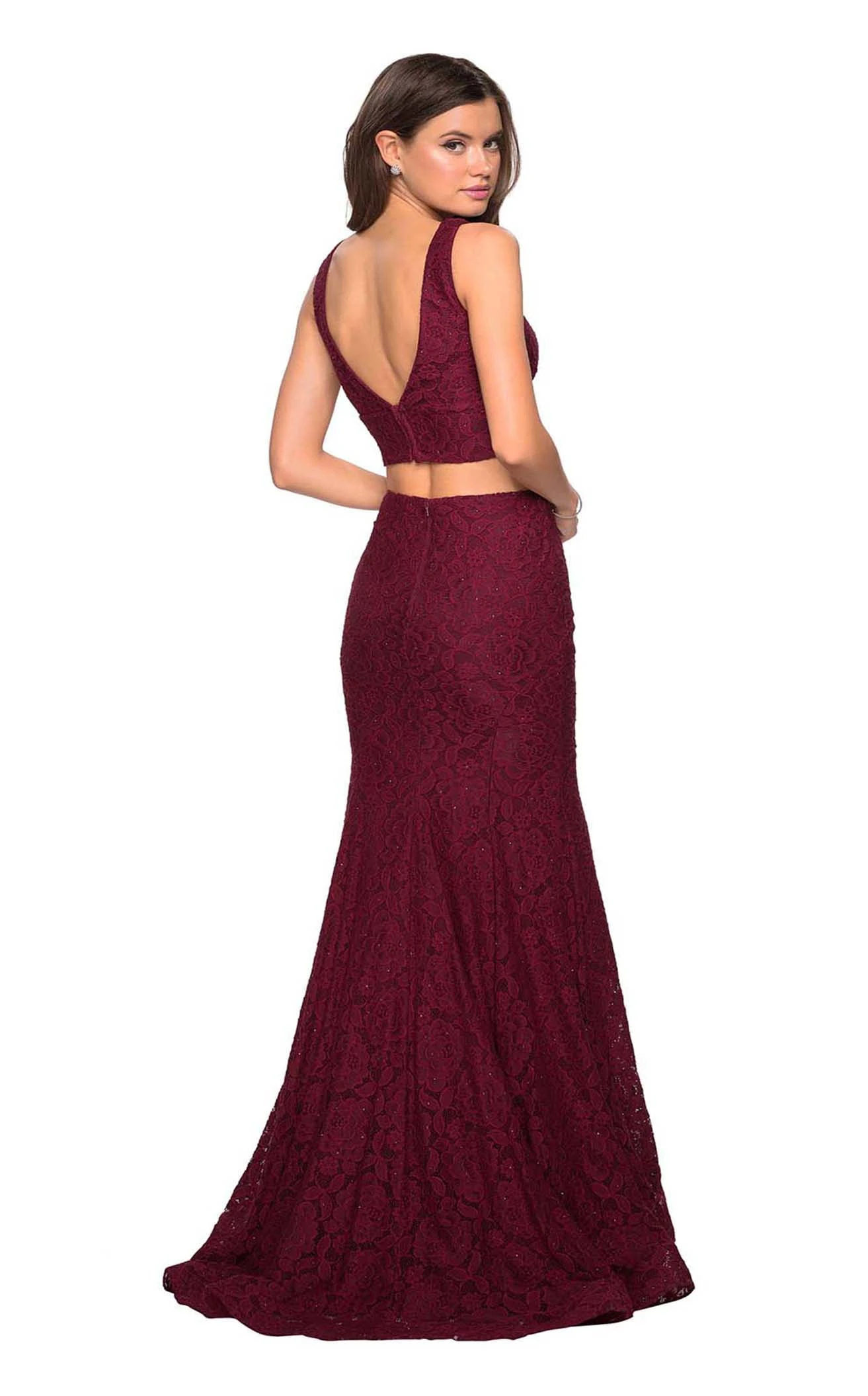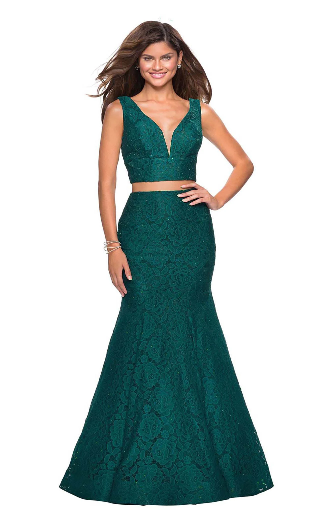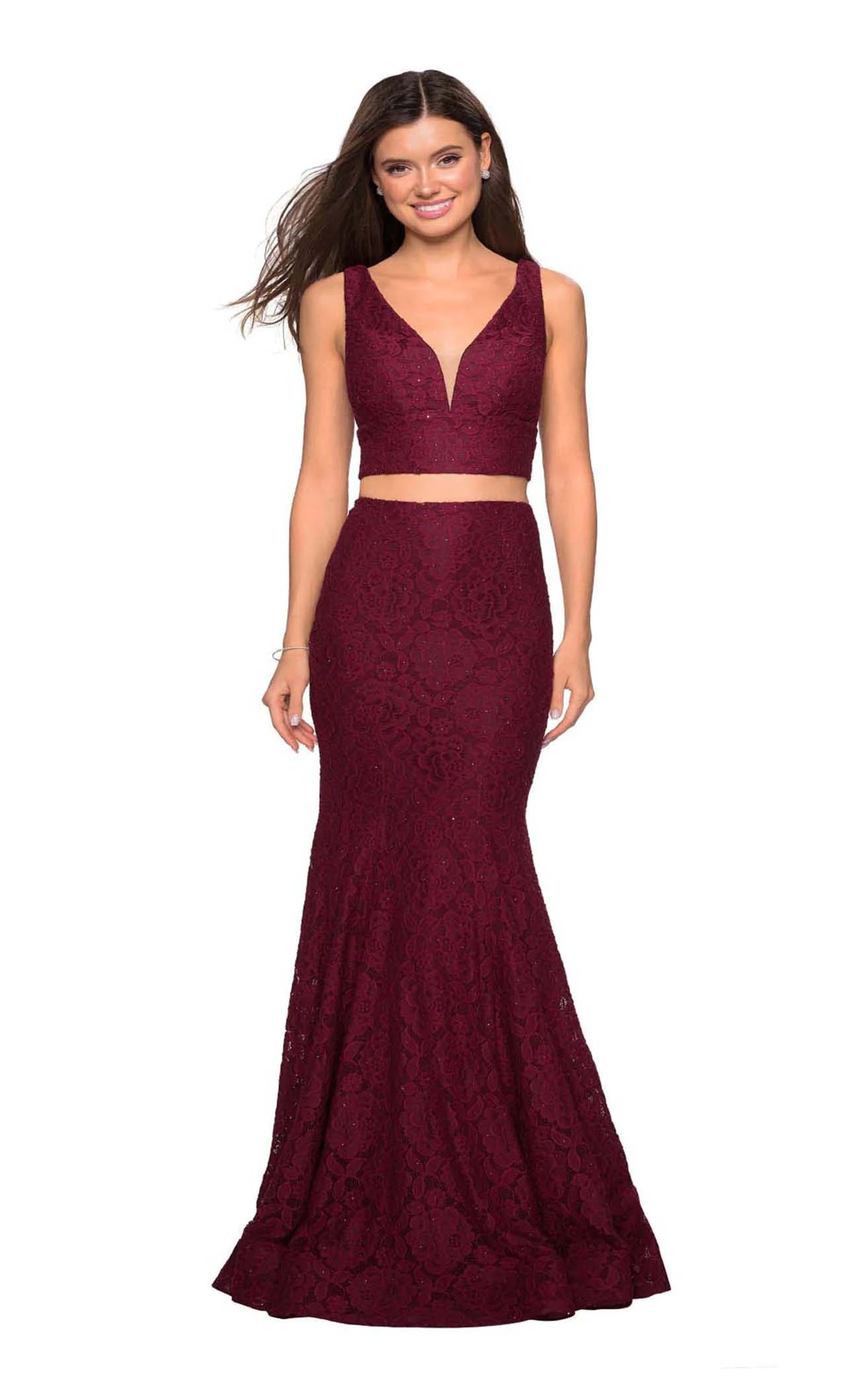 Two-piece mermaid gown with sheer inset V-neckline by La FemmeThis flattering mermaid-style dress from La Femme is sure to win hearts! It has a sleeveless fitted crop top bodice embellished with shimmering floral appliques. The V-neckline is supported by tapered straps that open to a V-cut back. The striking full-length skirt has a classic mermaid silhouette that ends with a dramatic sweep train.
