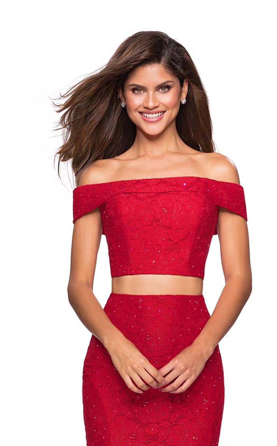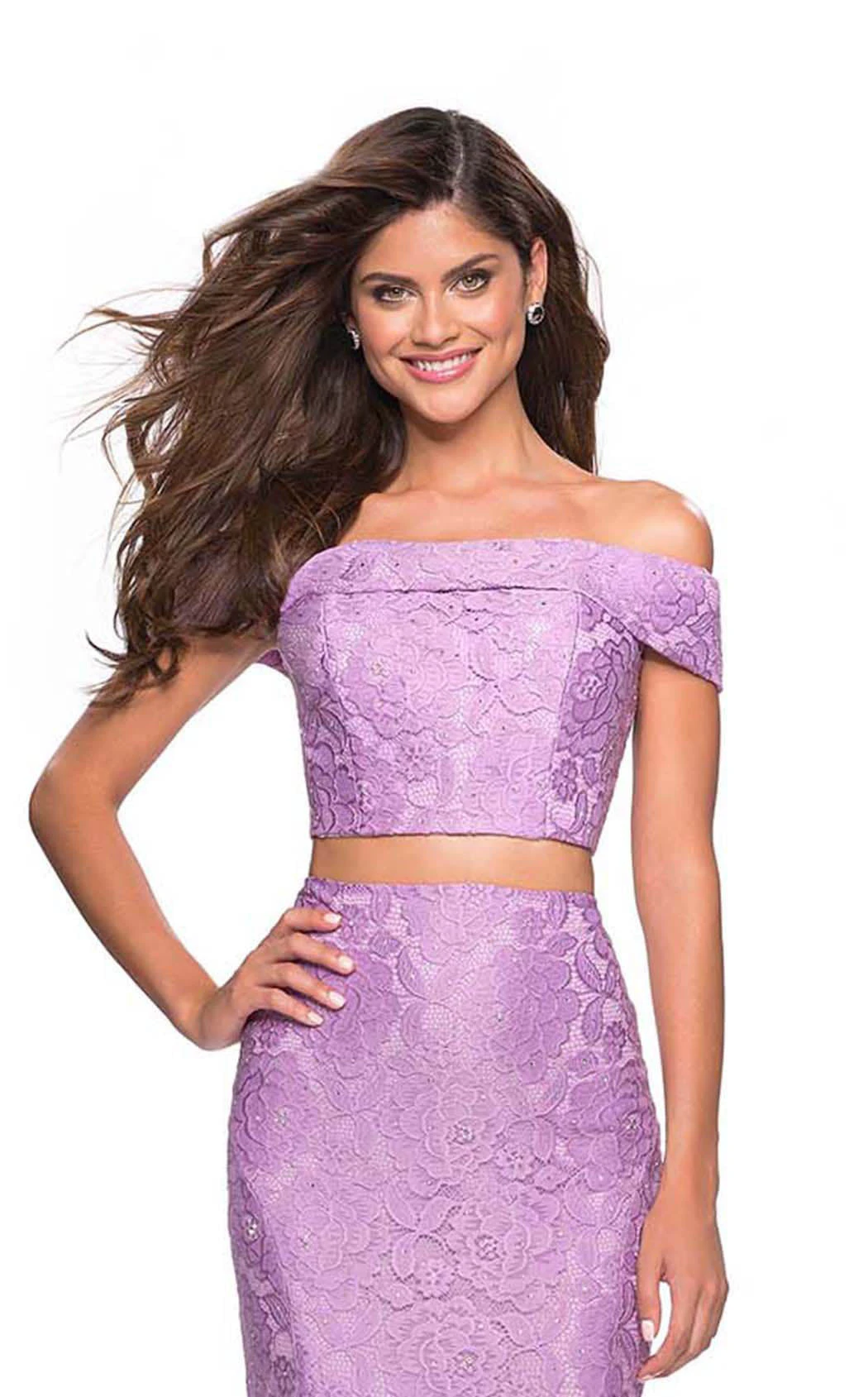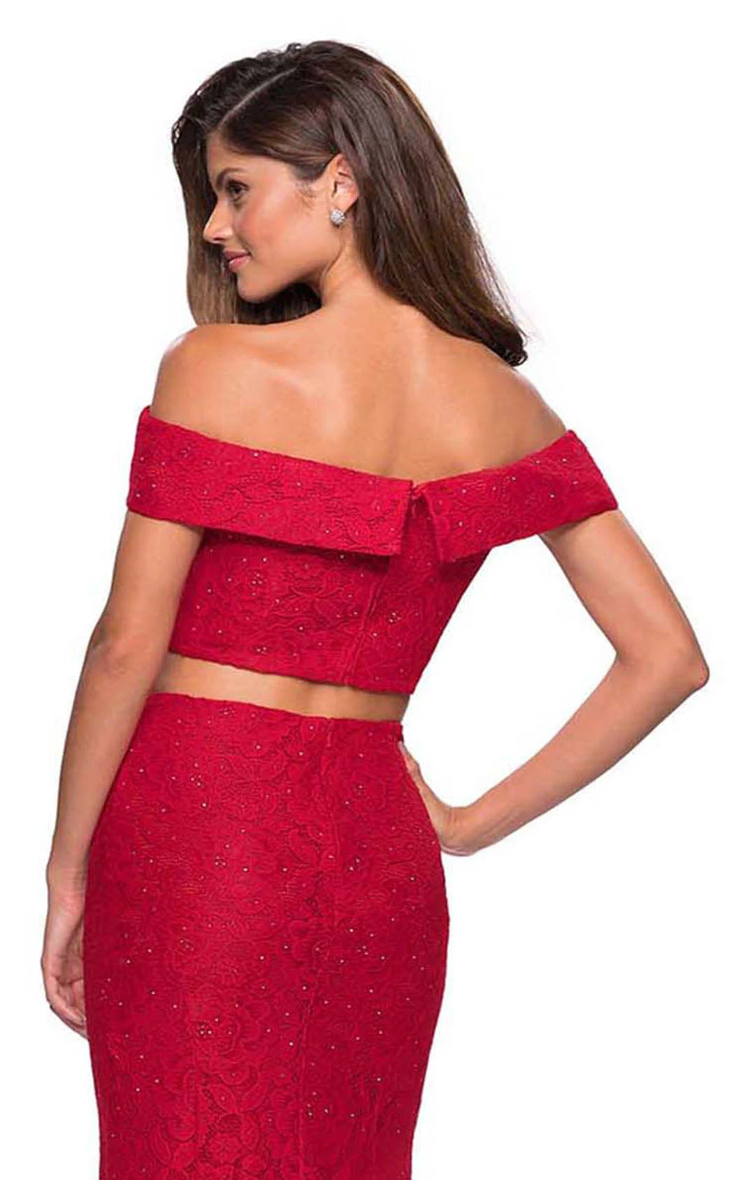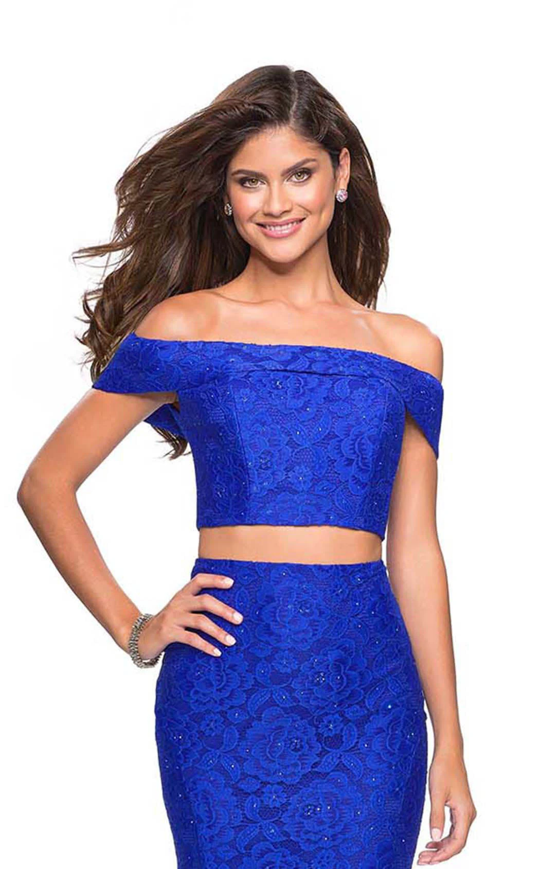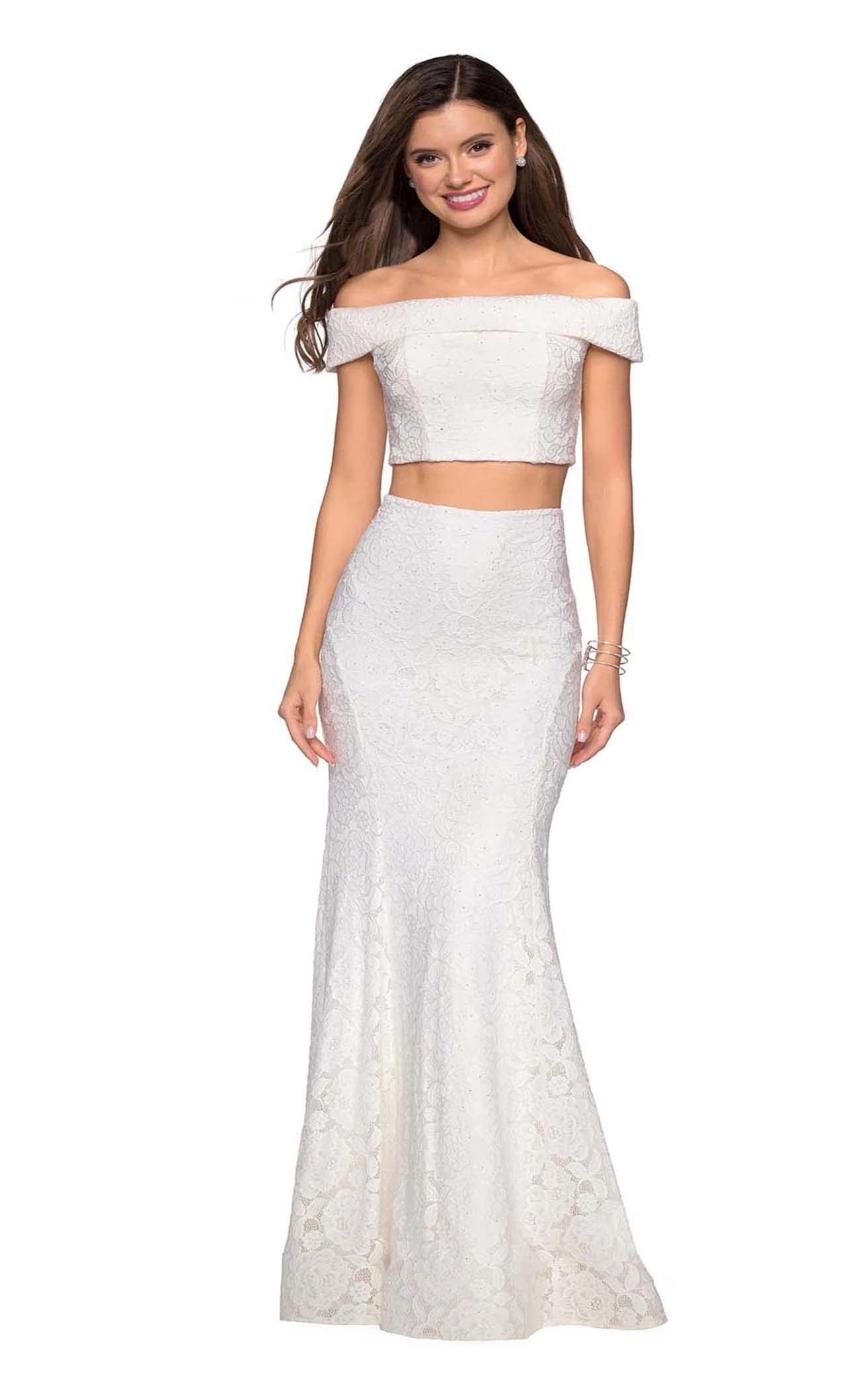 Two-piece off-shoulder formfitting mermaid gown designed by La FemmeLook glamorous in this long fit-and-flare two-piece gown from La Femme. Featuring a straight across neckline, the fitted off-shoulder crop top bodice is embellished with rhinestones and floral appliques. The skirt flares from the knees in a mermaid silhouette with a gorgeous sweeping train.
