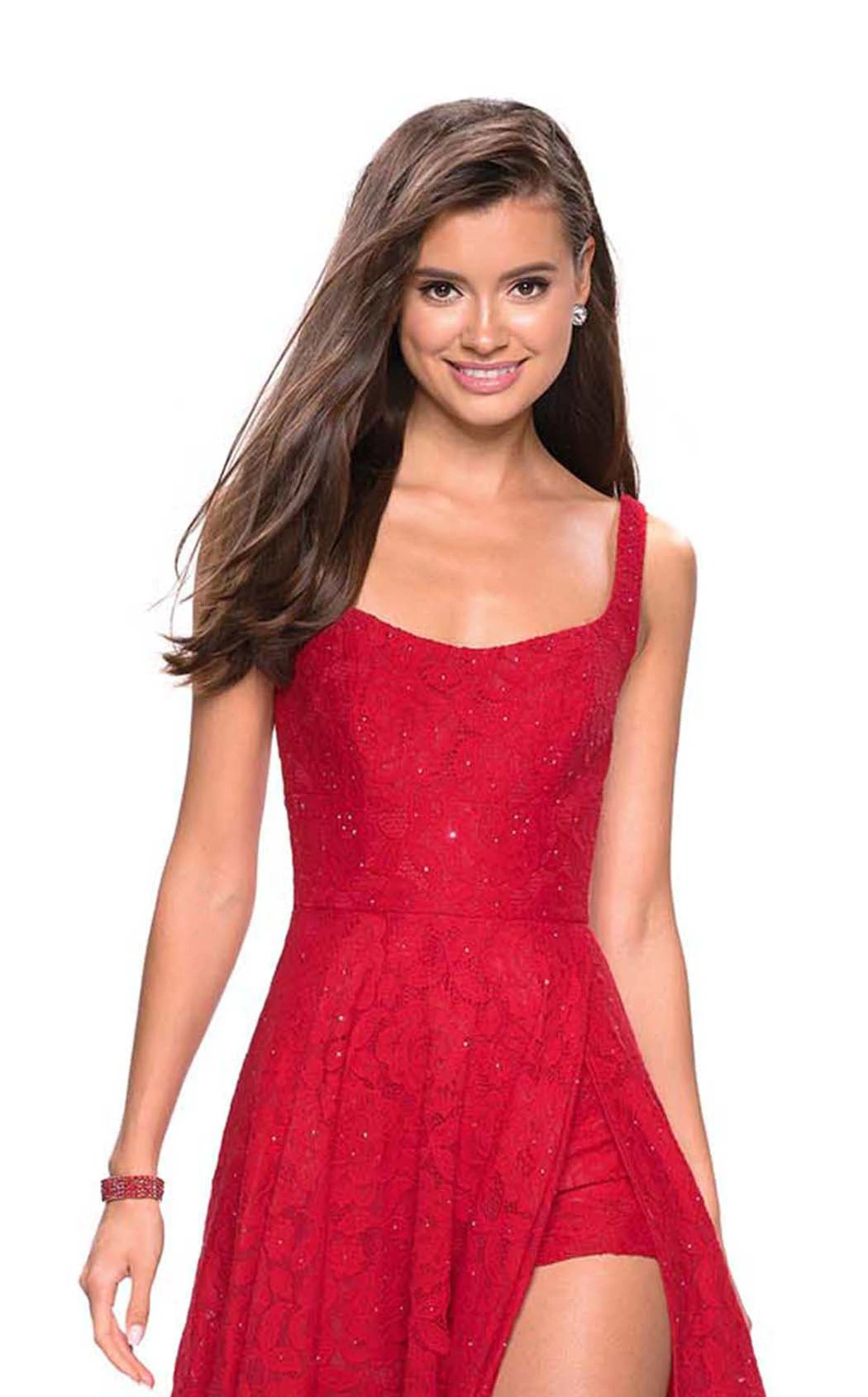 Square neck A-line gown with scoop back and romper shorts by La FemmeDesigned by La Femme, this gorgeous A-line gown skims your figure to highlight its beauty. The versatile style looks good on both by plump and slender figures. Embellished with floral appliques, the gown has a sleeveless with a square neckline with scoop back. The thigh-high slit in the A-line silhouette skirt reveals your sexy legs and the featured romper shorts.