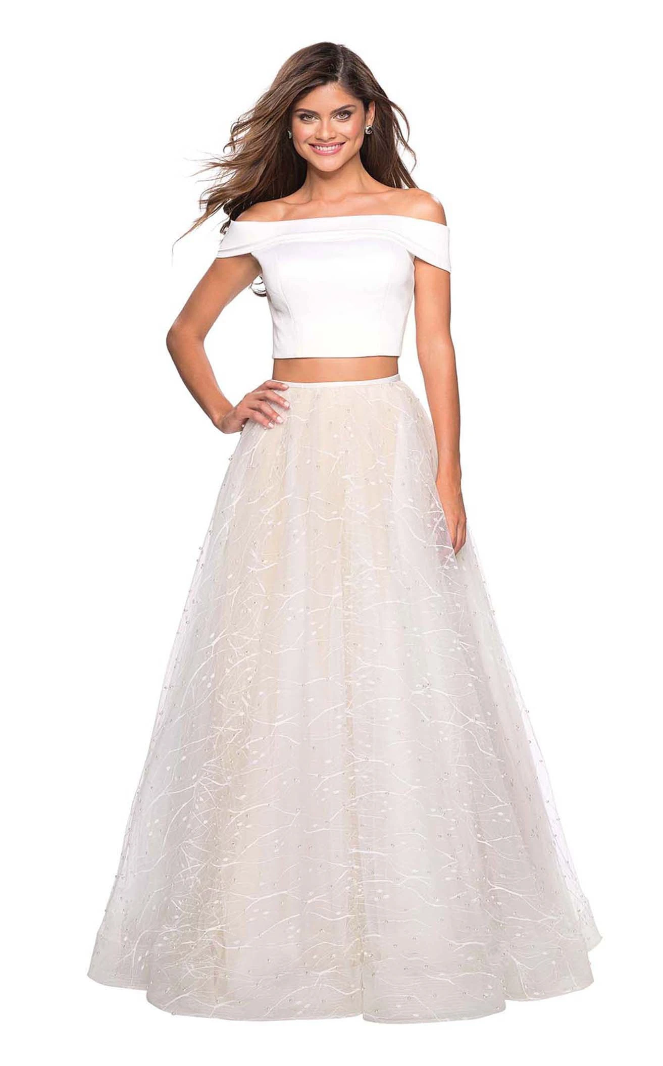 Two-piece off-shoulder ball gown tiered fold over straight neck by La FemmeLook impeccable for senior prom in gorgeous two-piece A-line gown designed by La Femme. Its off-shoulder crop top bodice has a tiered fold over straight neckline that wraps around to the partially open back. The tulle A-line silhouette skirt feature lace detailing and scattered beads along with a horsehair hem.