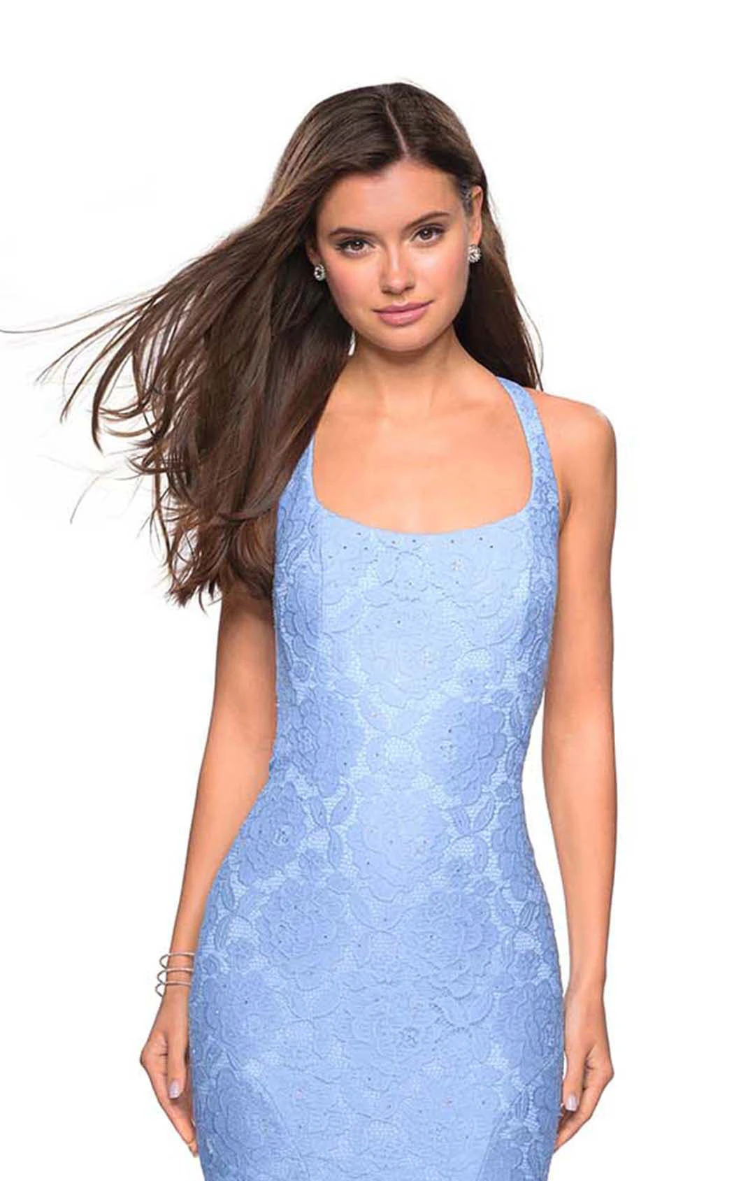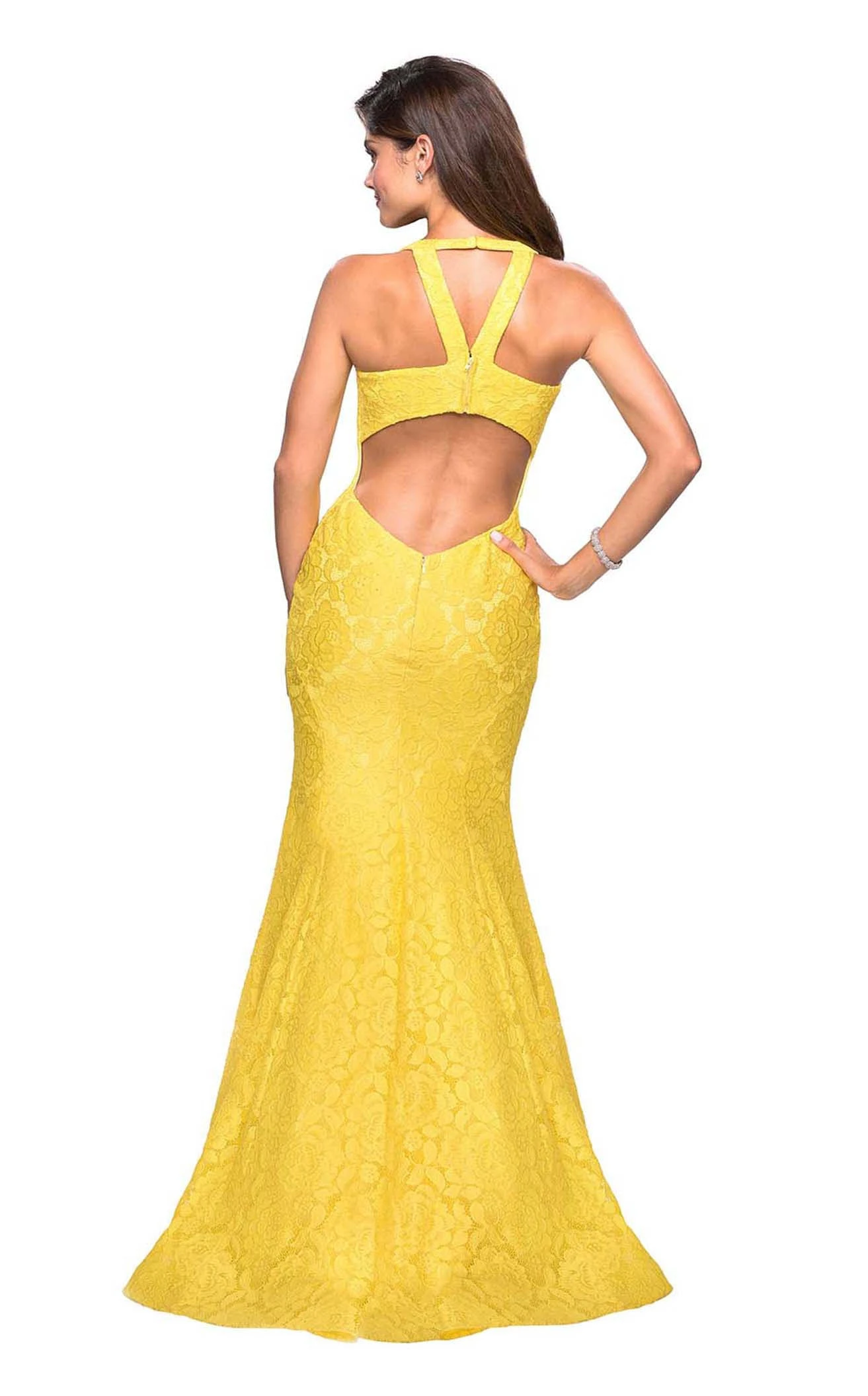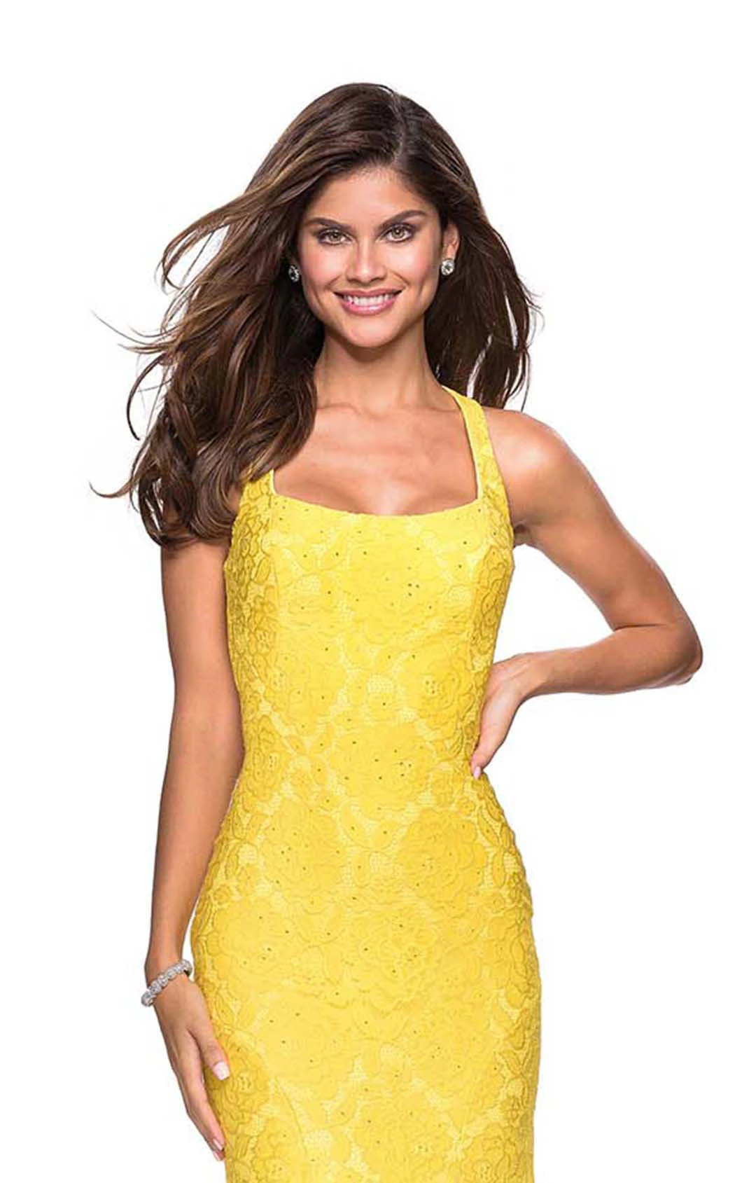 Floral appliqued trumpet gown with square neck by La FemmeWow the crowd in this fabulous formal dress from La Femme! Detailed in a square neckline, the fitted sleeveless bodice is held by tapered straps that connect to the triangular cutout bandeau back. Embellished with floral appliques and rhinestones, the gown has a trumpet silhouette skirt that flares mid-thigh to finish in a sweeping train.