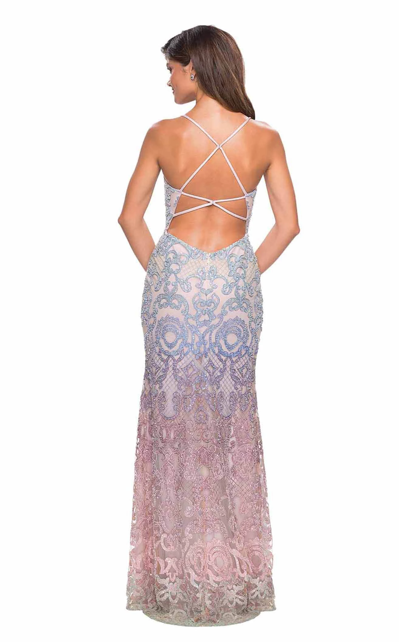 Sequined sheath gown with sheer inset plunging sweetheart neckline by La FemmeWear this radiant dress designed by La Femme and beam throughout the party. Topped by a sheer inset plunging sweetheart neckline and strappy open back, the dress is entirely embellished with ombre sequin work. The sheath silhouette of the skirt flows to the full-length and ends with a slight sweep train.
