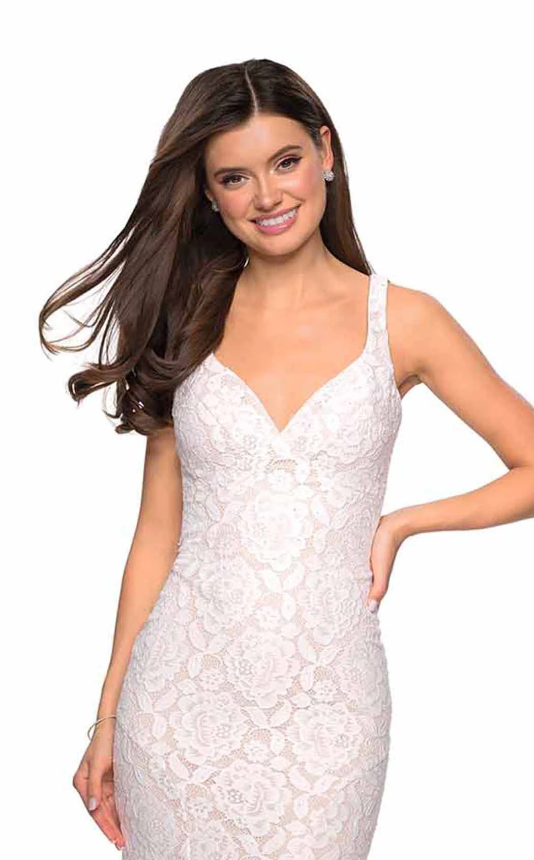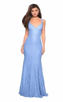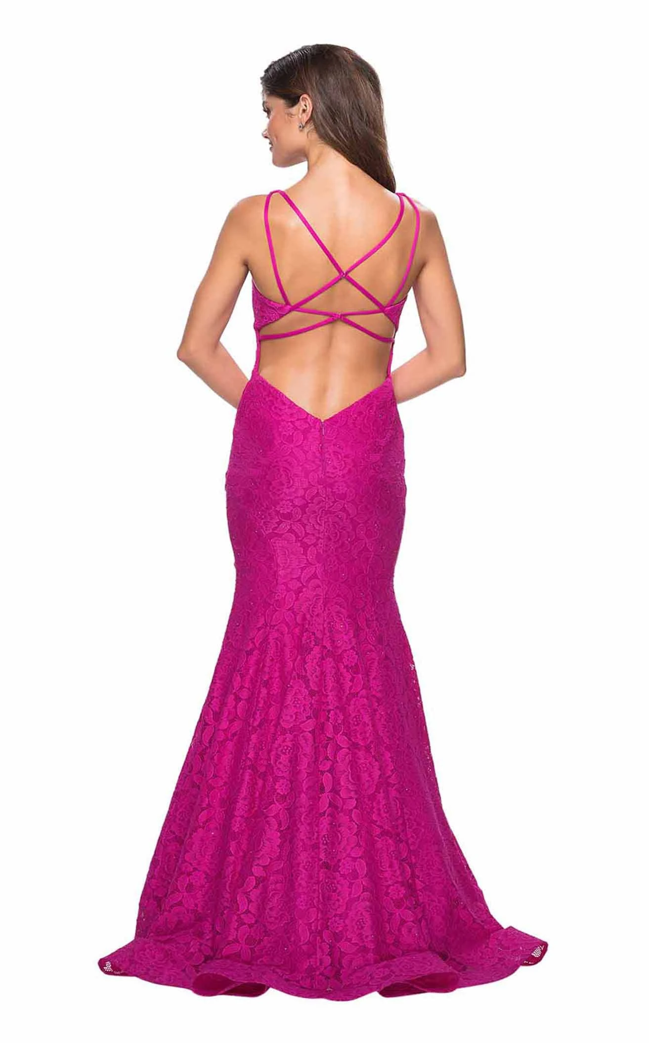 Floral appliqued mermaid gown with plunging sweetheart neckline by La FemmeLive up to your fashion style with this sophisticated mermaid gown designed by La Femme. Featuring a plunging sweetheart neckline with a seamed bust, this gown is fitted through the thighs to give you the perfect look. The slim-flare ensemble has a skirt that flares to the full-length mermaid silhouette hem and finishes off in a small sweep train.
