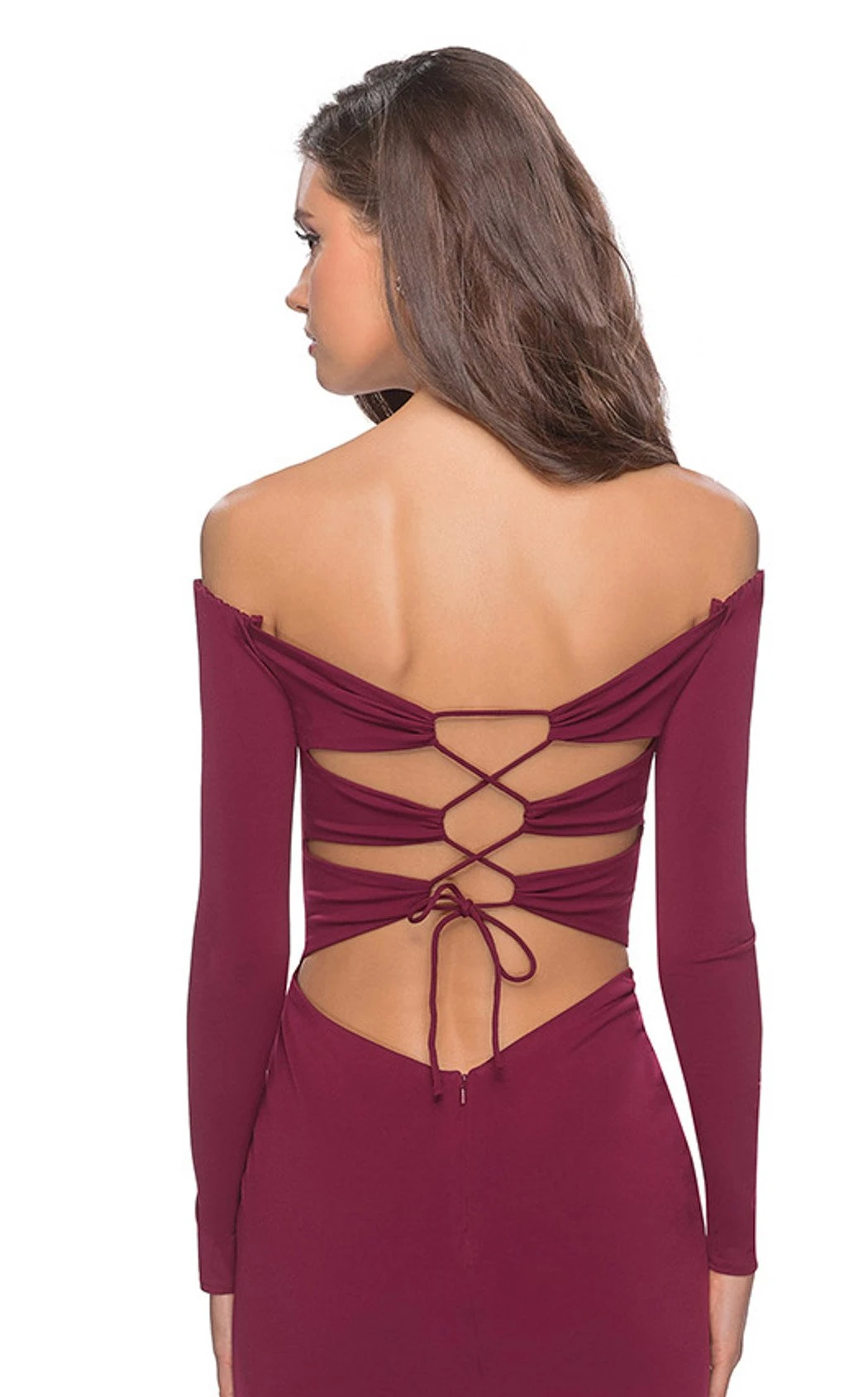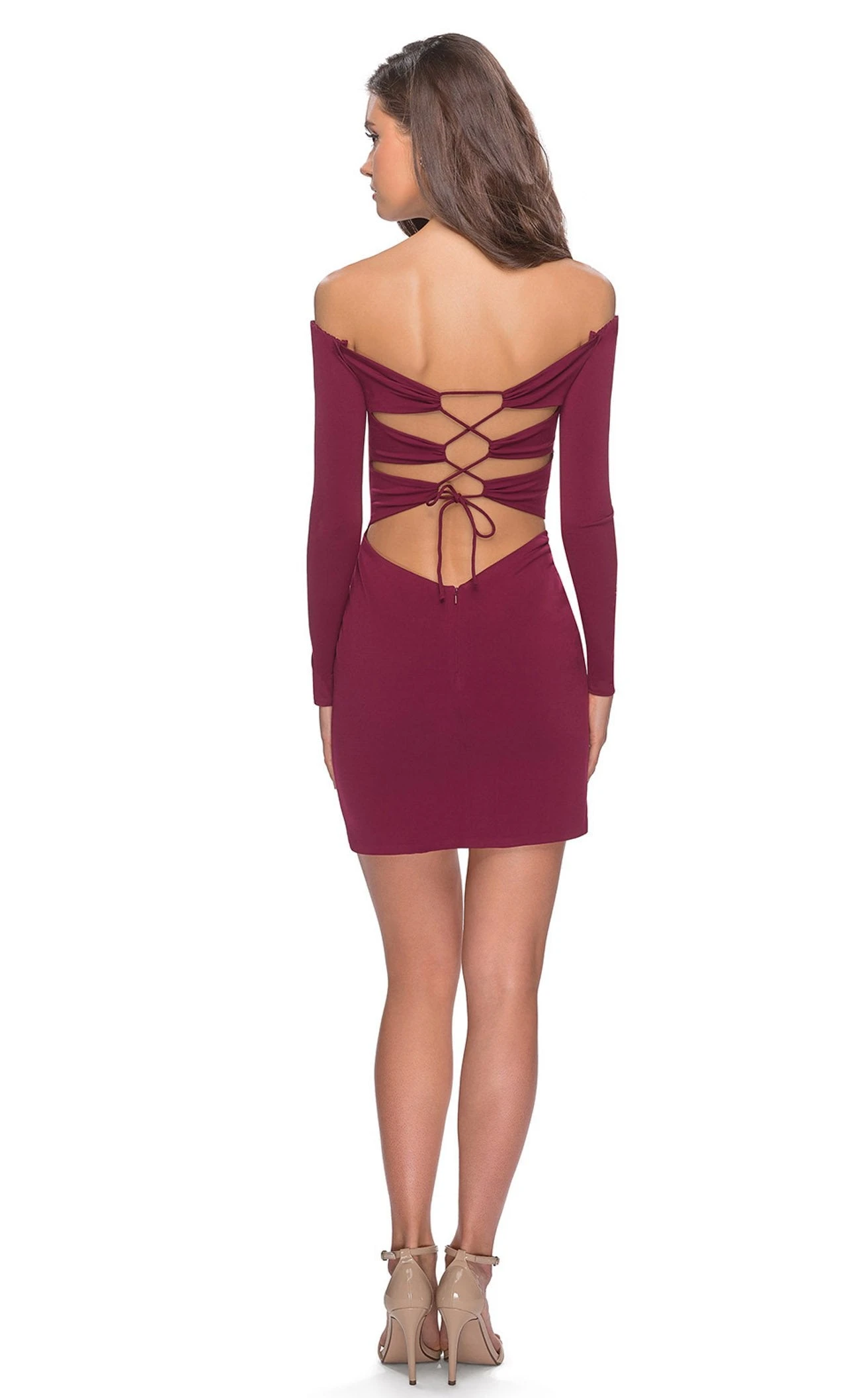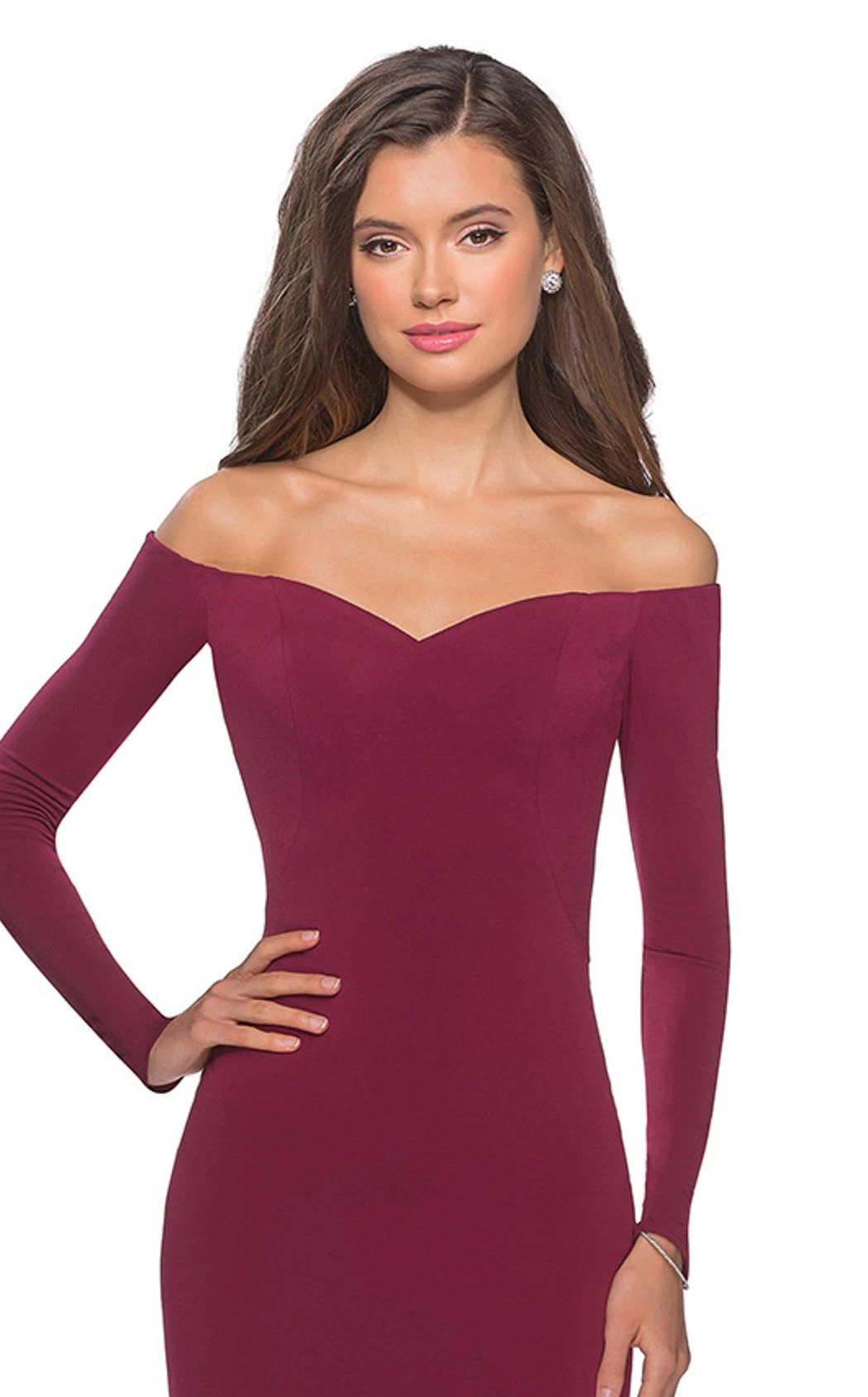 Suffuse your celebration with an air of romance in this sizzling short formal by La Femme. The off-the-shoulder, sweetheart neckline sets a lovely precedent while slender sleeves extend from the upper arms to the wrists. Sleek lines define the curves of bust, waist and hips, tracing a tantalizing silhouette, and the tapered skirt sluices to a marvelous mini finish.