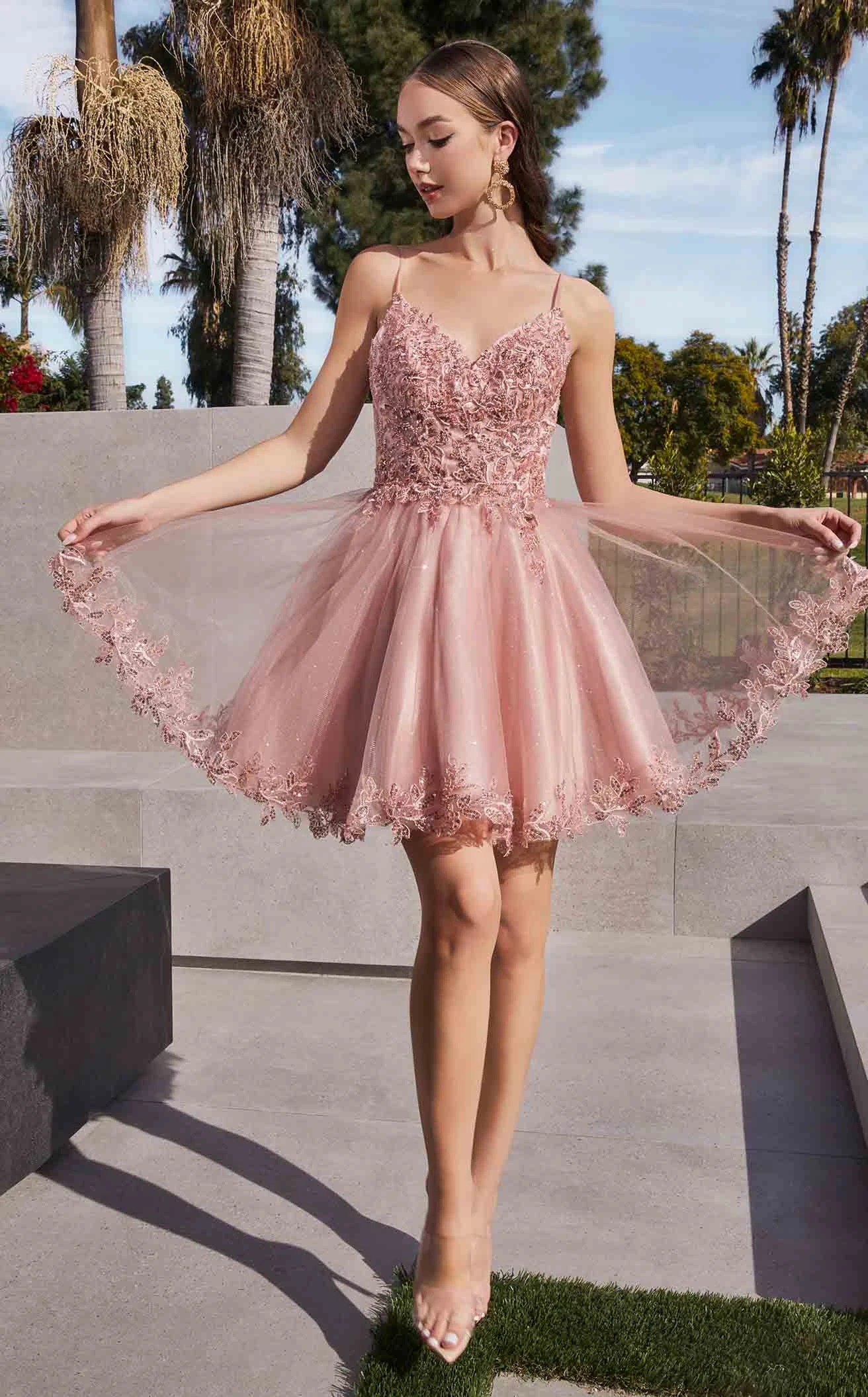 Make yourself feel pretty in this tulle dress designed by Ladivine. The slim spaghetti straps hold the dress from the shoulders and showcase the V-neckline on a heavily beaded lace bodice. This dress features a voluminous A-line silhouette that flares from the natural waistline and ends above the knees.