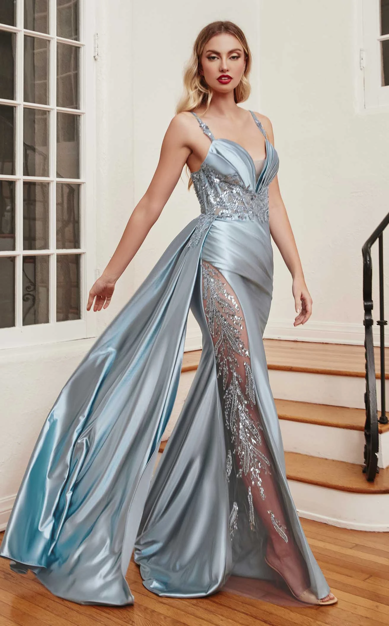 This stunning dress by Ladivine is all about subtlety and glamor. It comes with a plunging mesh V-neckline and pleated details on the bustline. The embellishments on the shoulder straps resemble the sequin-embroidery details on the bodice. With pleats and a panel train, the natural waistline follows a full-length skirt.