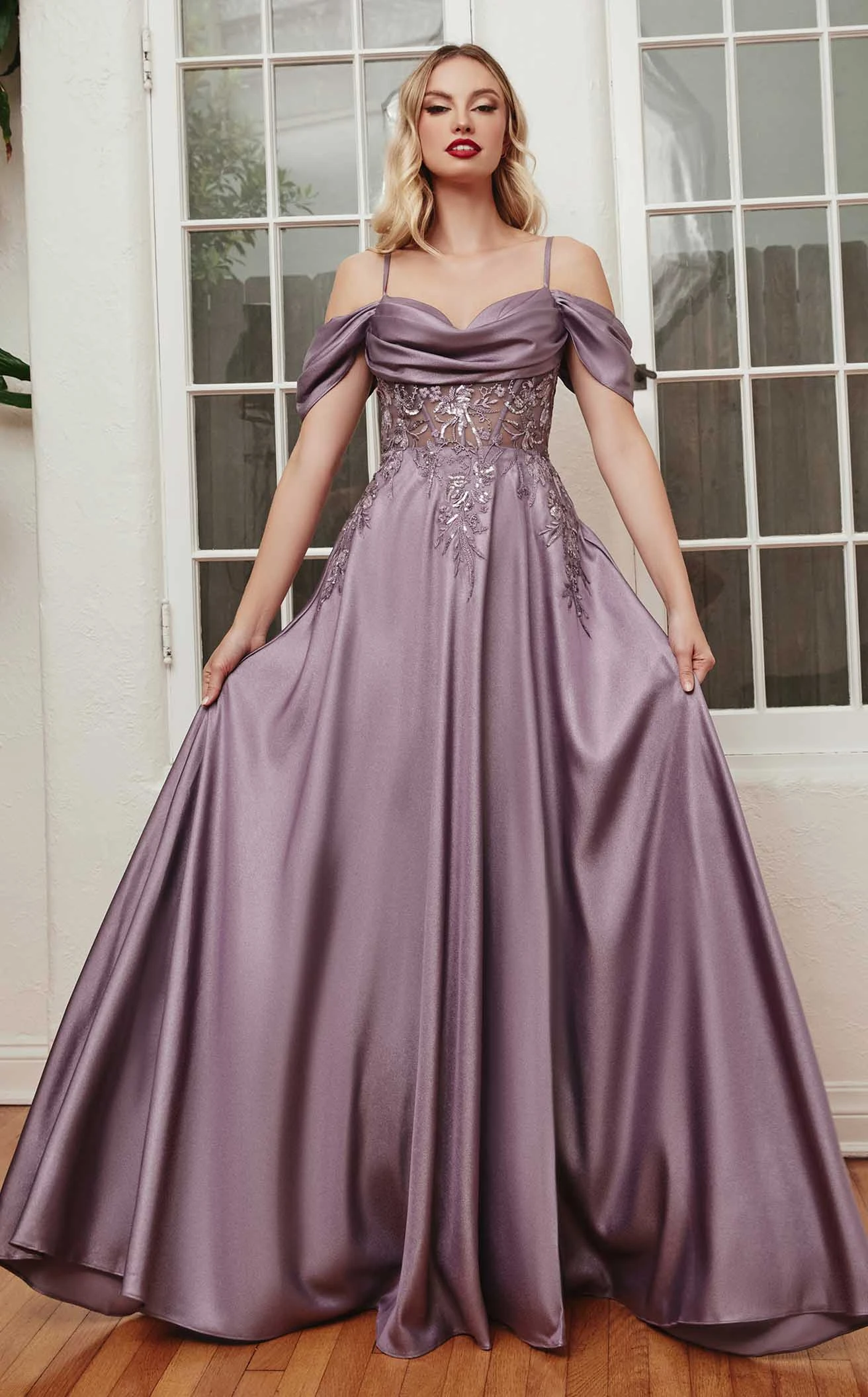 In this lovely Ladivine satin gown, stroll in style and watch as all eyes are drawn to you. It comes with a sweetheart neckline with cowl details on the hem. The shoulder straps and draped sagging sleeves combine to form cold off-the-shoulder sleeves. It has an illusion bodice with sequin beaded embellishments. This full-length dress has an A-line flowy skirt with a thigh-high slit.