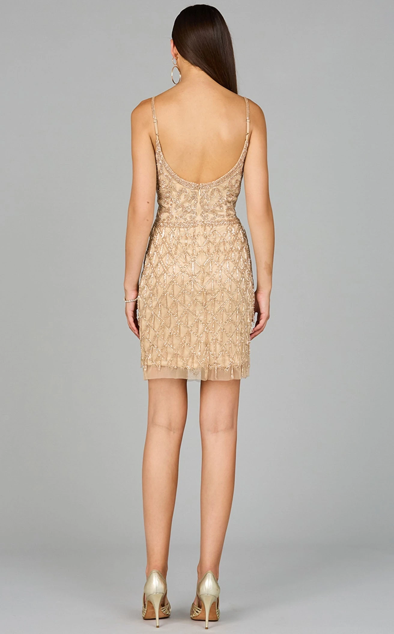 Indulge in sophistication with the stunning 29068 dress by Lara. This dress exudes refined elegance with its clean lines and sheath silhouette, creating a look that is both sleek and timeless. The V-neckline adds a touch of sophistication, framing the neckline with understated charm. Its mini-length offers a contemporary look, perfect for date nights.