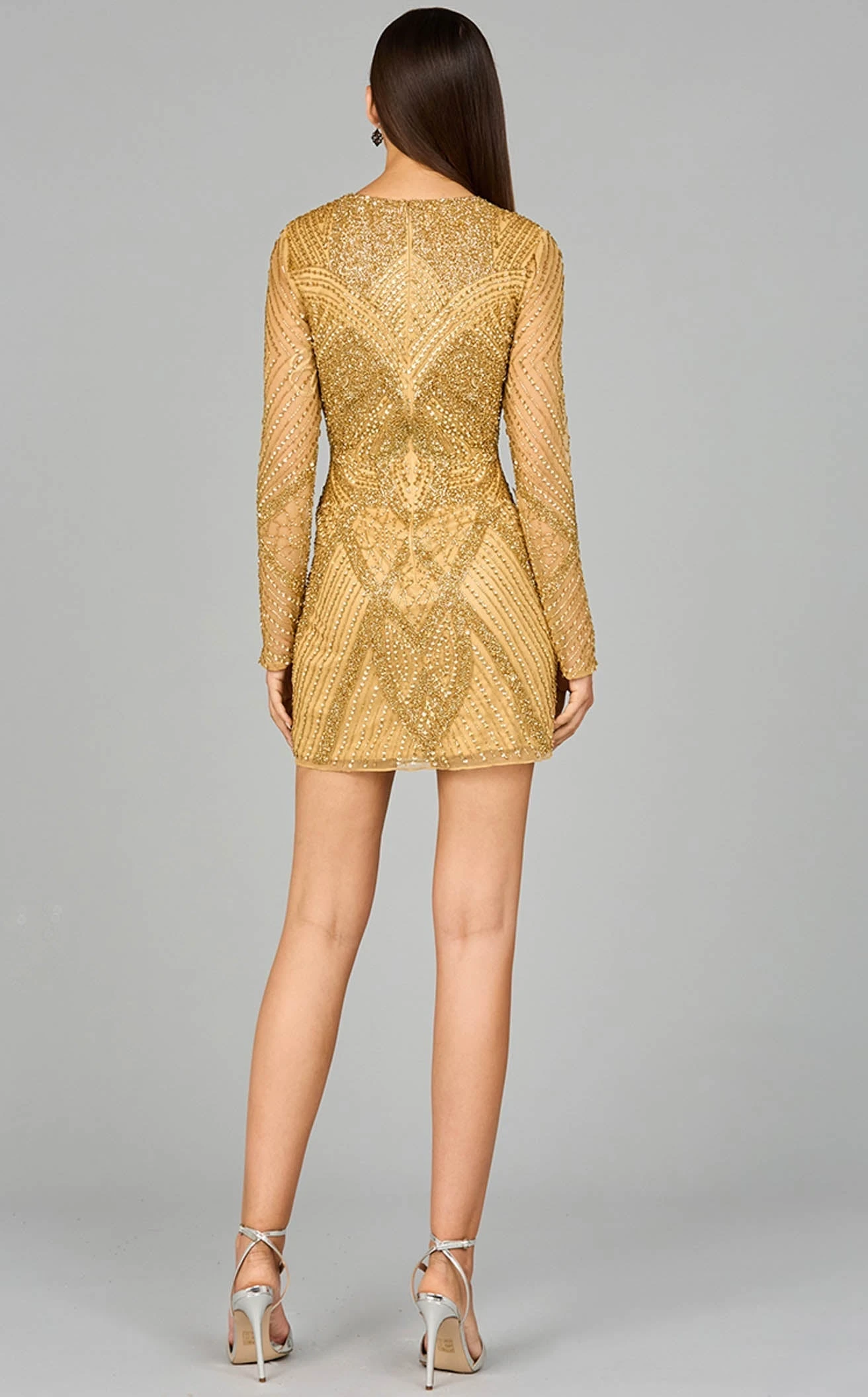 Beaded Jewel Neckline Long Sleeves Short Dress by Lara