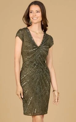 Radiate sophistication and allure in the Lara 29119 cocktail dress. With its intricately embellished linear pattern of beads and sequins, this dress exudes a stunning sparkling elegance. The classic V-neckline and elegant cap sleeves add a touch of timeless refinement, while the daring cutout design at the back adds a contemporary twist to the classic silhouette. The sheath skirt gracefully skims your curves, culminating in a chic short hemline that accentuates your every move.