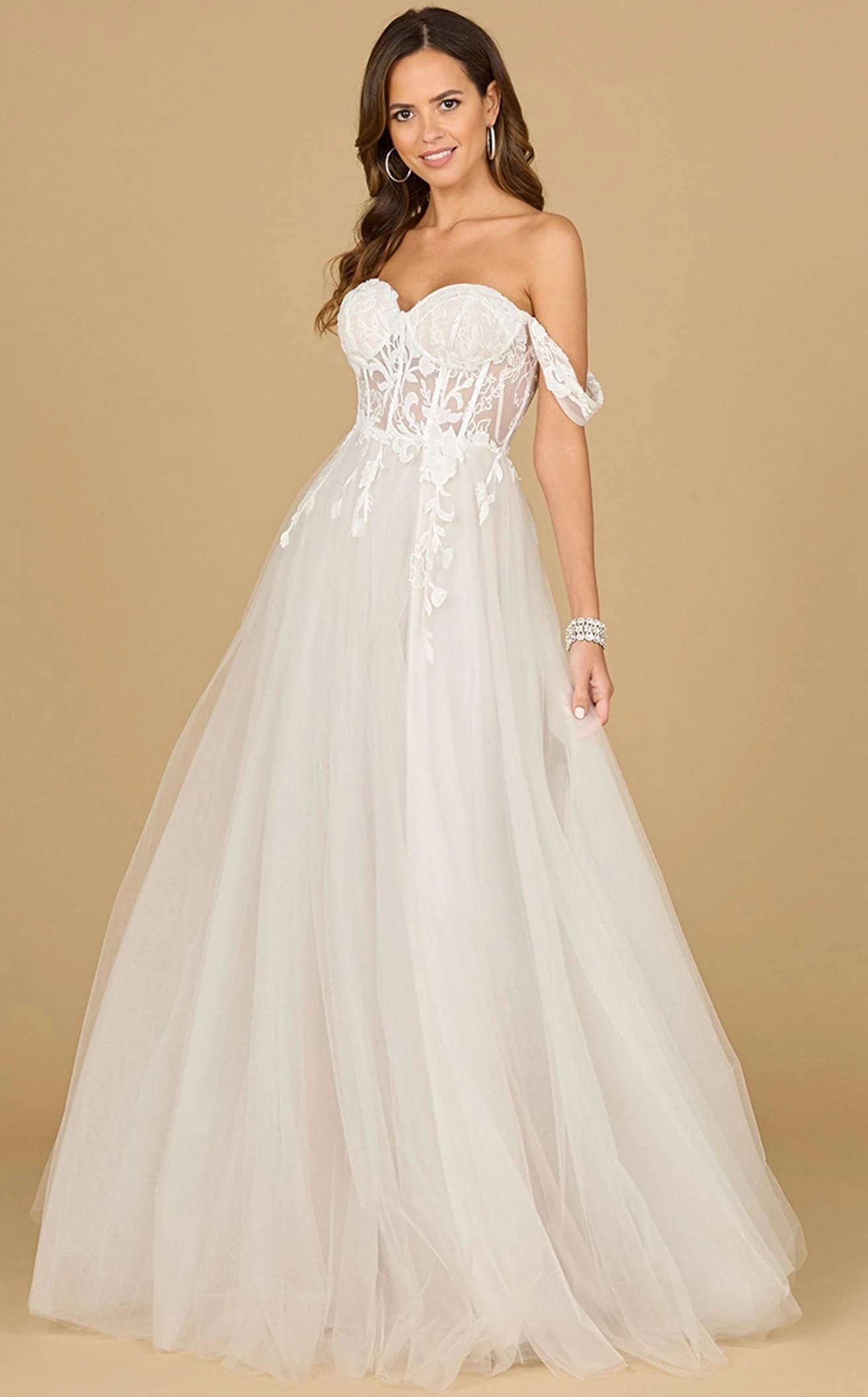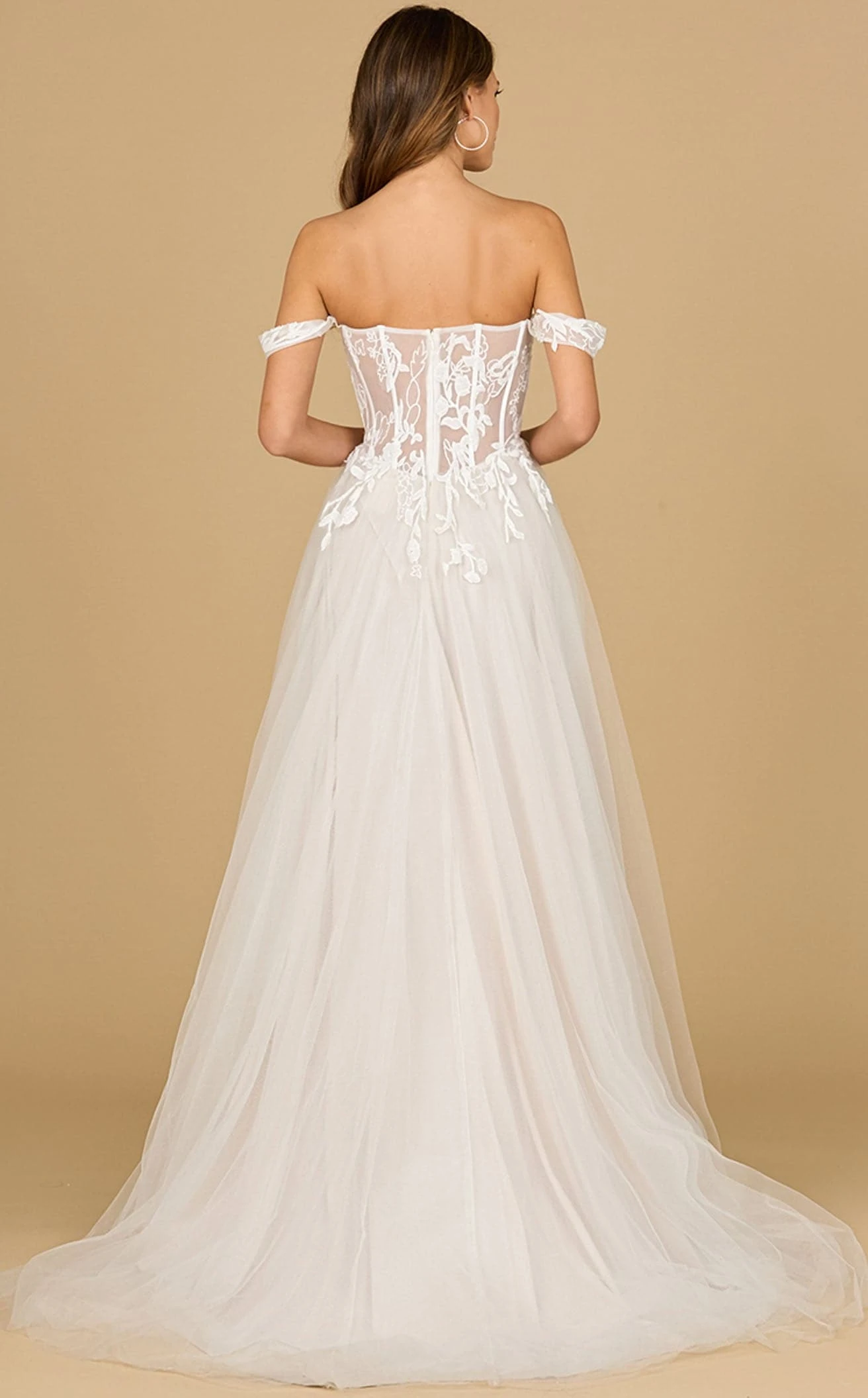 Experience the essence of bridal grace and allure in the stunning Lara 51114 gown. This gorgeous wedding gown boasts an alluring off-shoulder corset bodice adorned with intricate lace applique embellishments. The romantic sweetheart neckline and mid-open back exude timeless charm. The floor-length A-line skirt features a daring slit that adds a touch of allure and is complemented by the sweeping train for a regal finish.