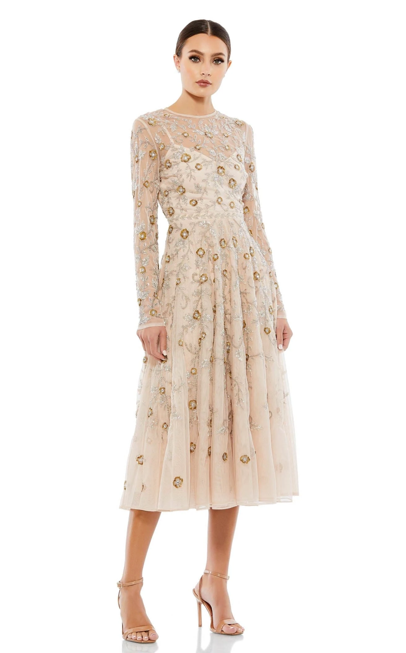 Look gorgeous in this midi dress by Mac Duggal. A dress for any body shape allows you to hide all your sins. The sheer bodice shows full embellished sleeves, a high neckline and a sheer back. The full sleeved bodice is adorned in sequin embroidery showing details of flowers and leaves. The sequined leaf details along the waist show the natural shape. An A-line midi skirt flourishes in a full-length hem.